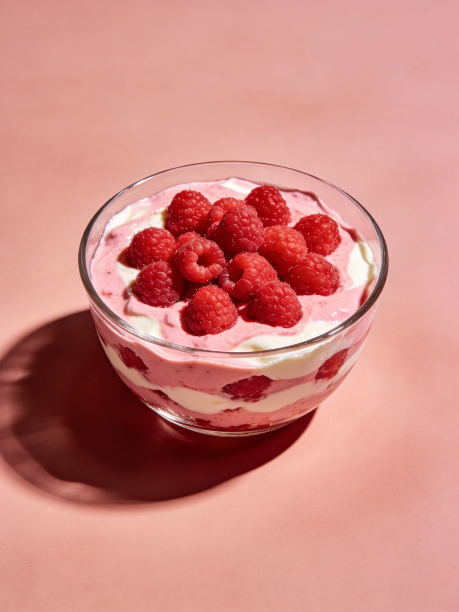 A glass bowl of layered yogurt and raspberry puree topped with fresh raspberries, set on a pastel pink background.