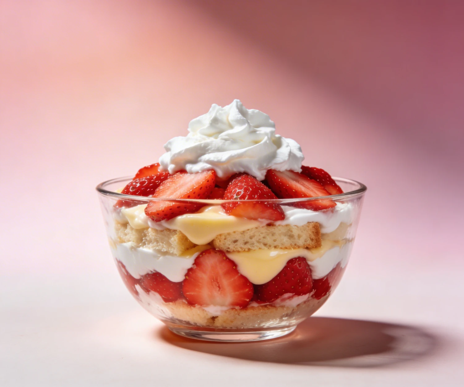 A delicious layered dessert with strawberries, whipped cream, sponge cake, and custard in a glass bowl, perfect for a sweet treat.