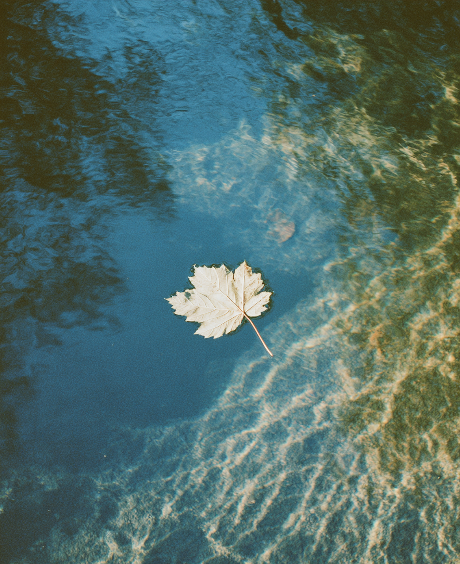 A single leaf floats on calm water with rippling patterns and vivid reflections, capturing serene and artistic natural beauty.