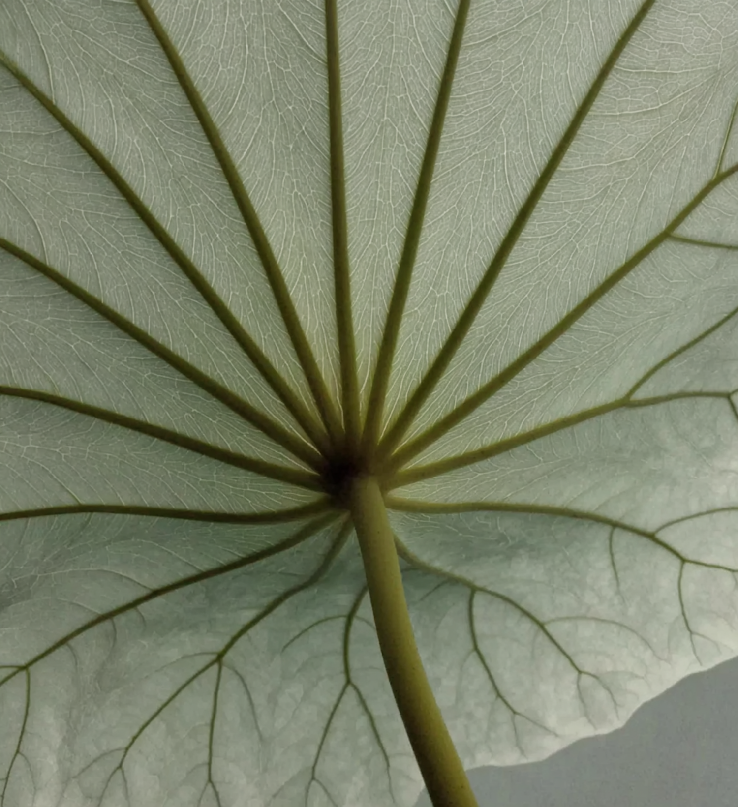 Close-up of a leaf's underside, highlighting its intricate vein structure and translucent texture with a neutral background.