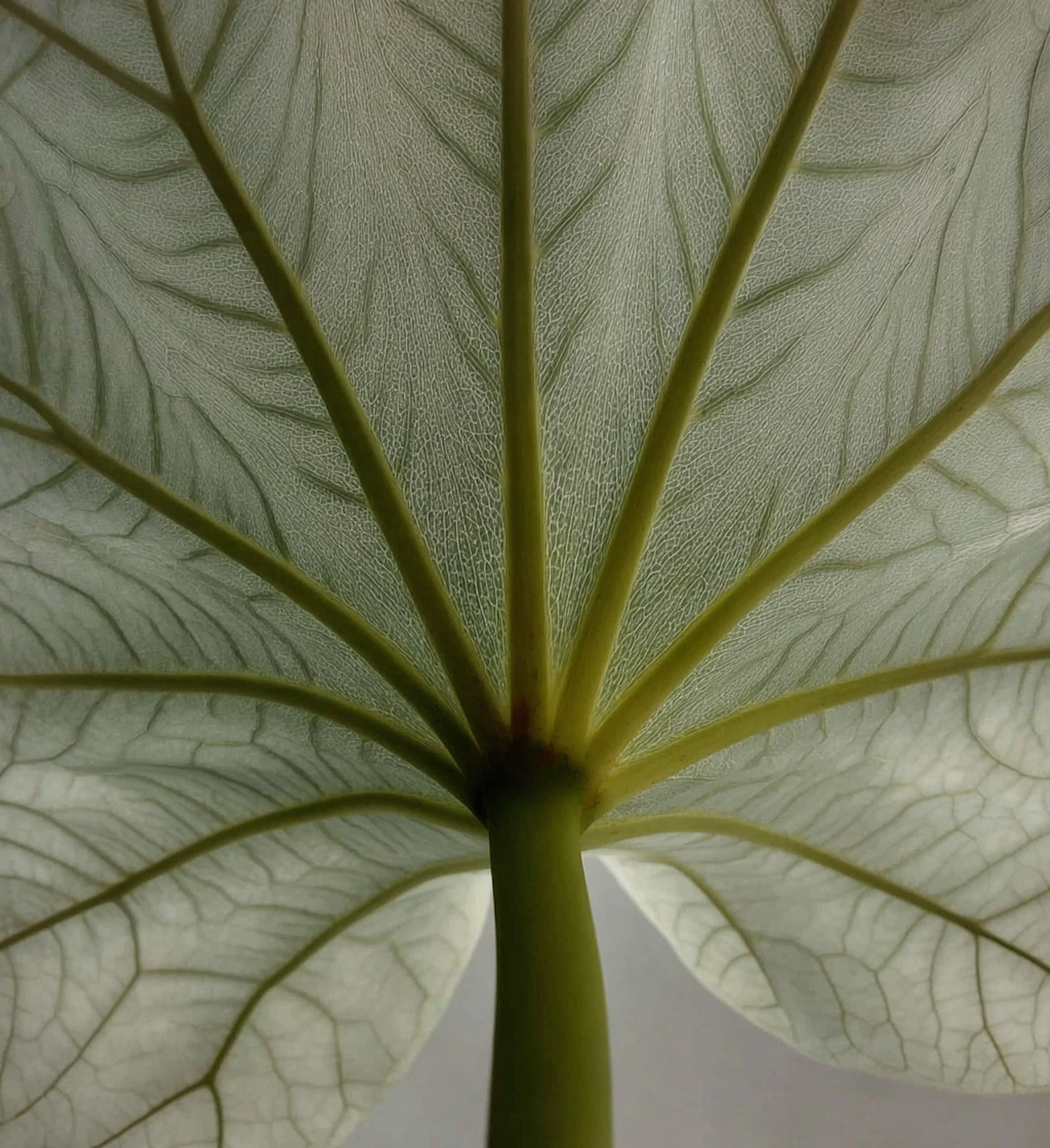 Close-up of a leaf's underside, highlighting its intricate vein structure and translucent texture with a neutral background.
