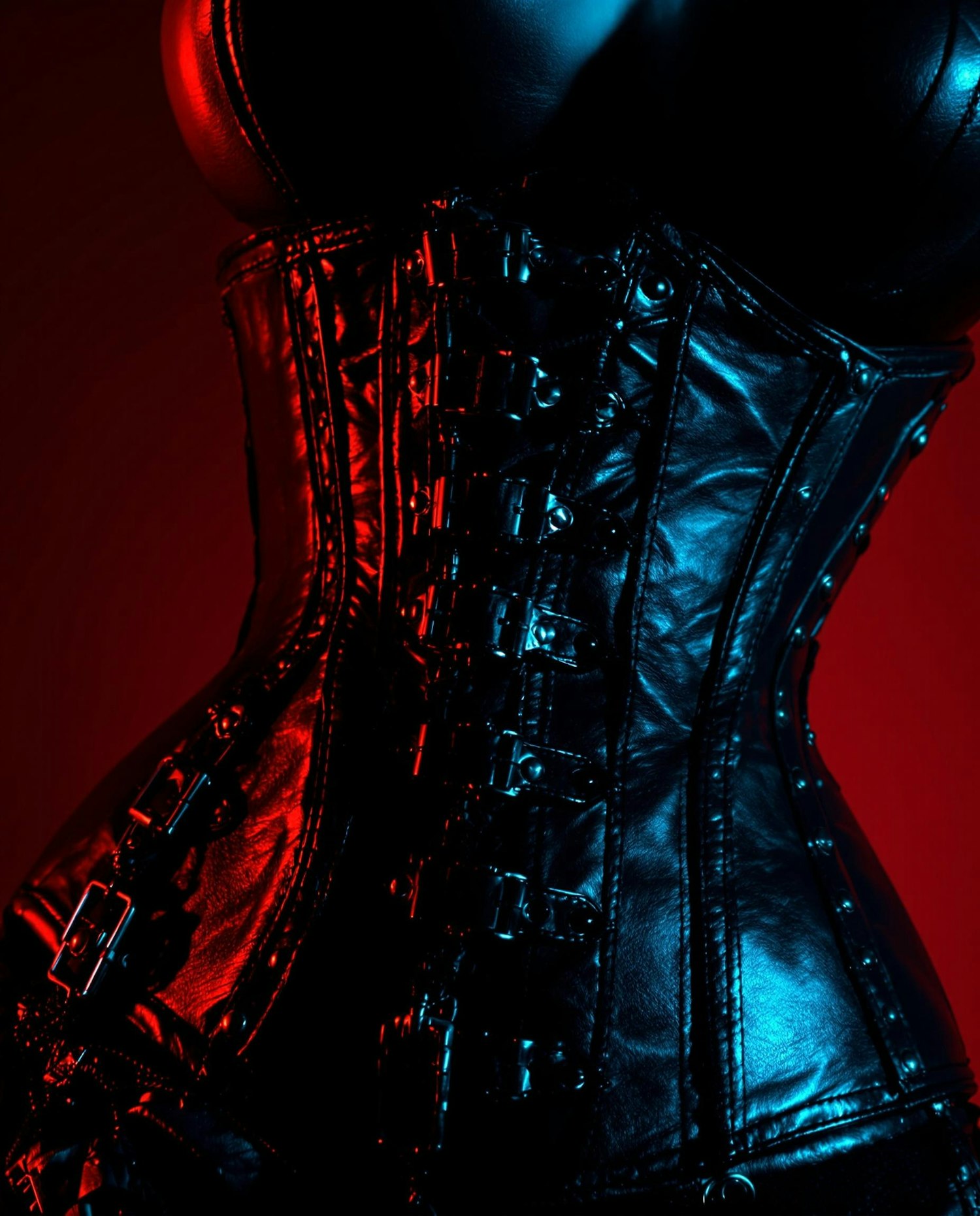 A close-up shot of a sleek leather corset, accentuated by vibrant red and blue lighting, showcasing fine details and edgy tones.