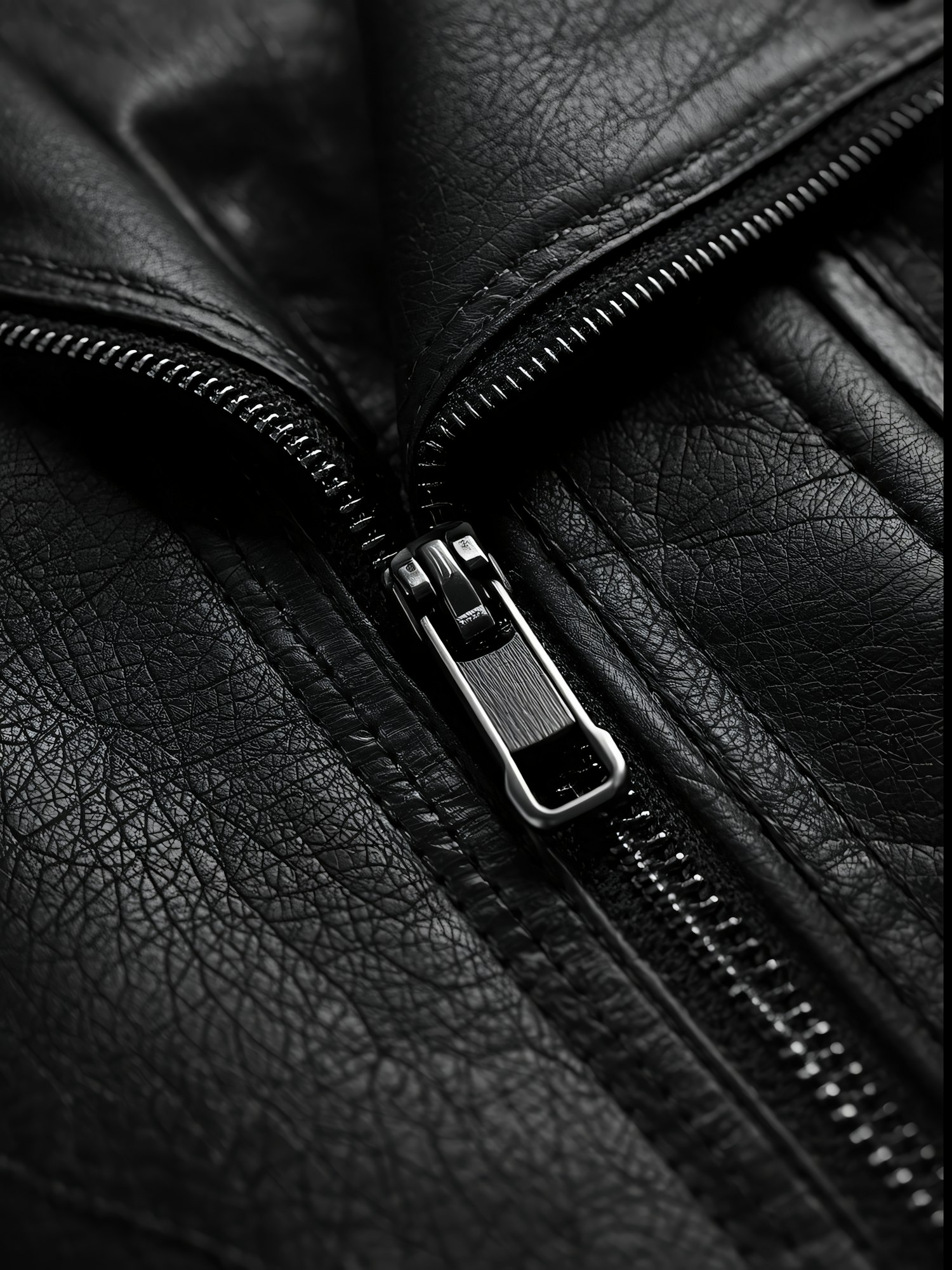 Close-up of a black leather jacket's zipper, highlighting the detailed texture of the leather and the metallic finish of the zipper.