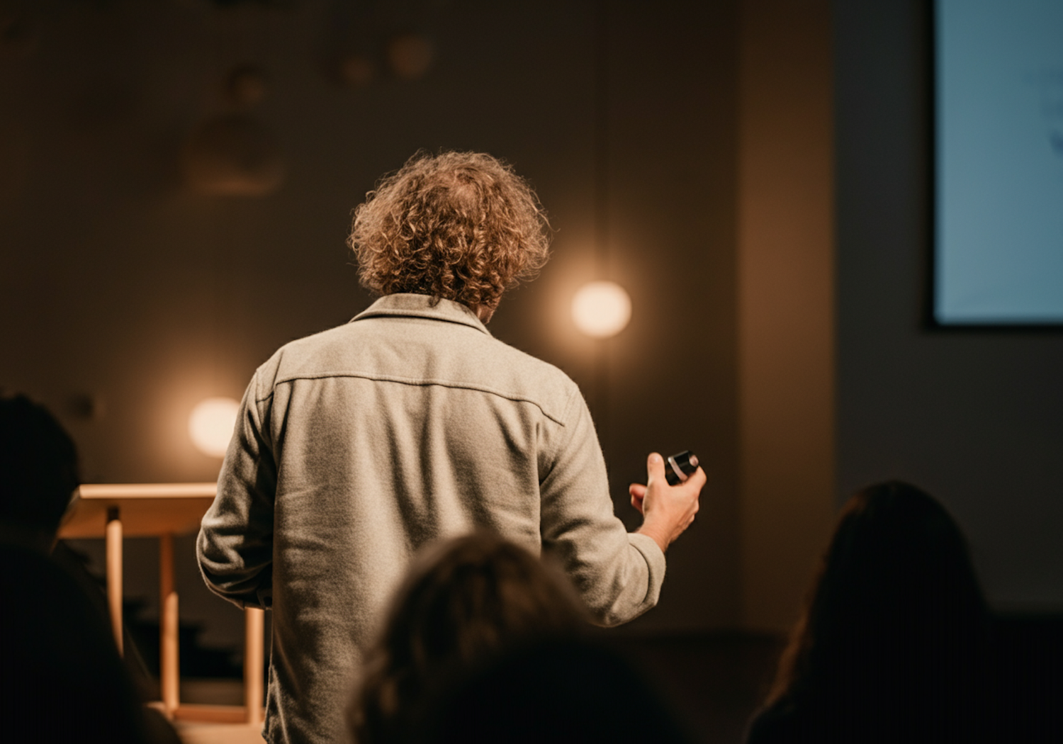 A presenter with curly hair and a light jacket speaks to an audience in a warmly lit room, holding a small device.
