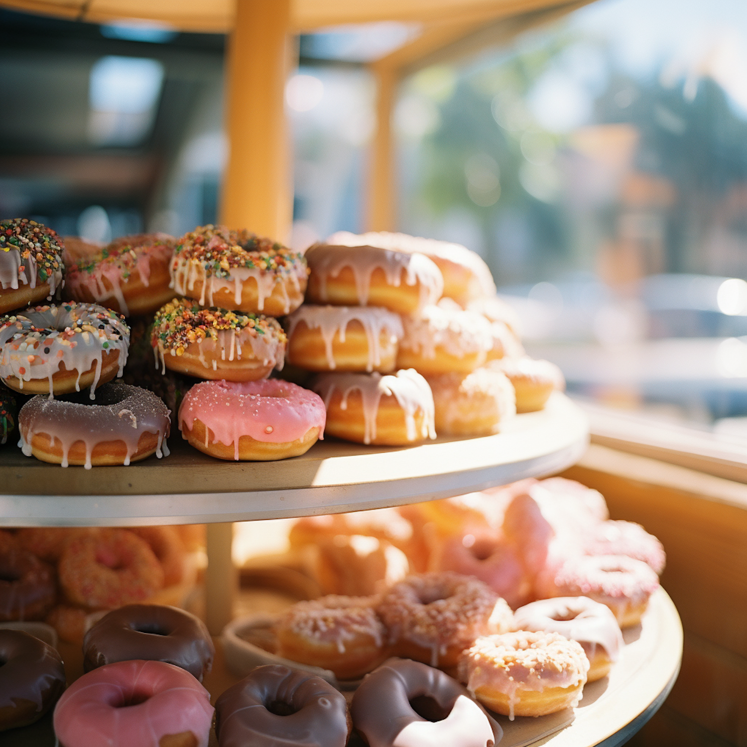 Assorted donuts with colorful icing and sprinkles on a tiered stand, bathed in warm sunlight, creating a cozy and inviting scene.