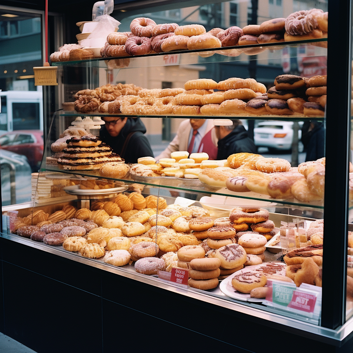 Bakery display with assorted pastries and donuts in an urban setting, showcasing a variety of textures and colors.