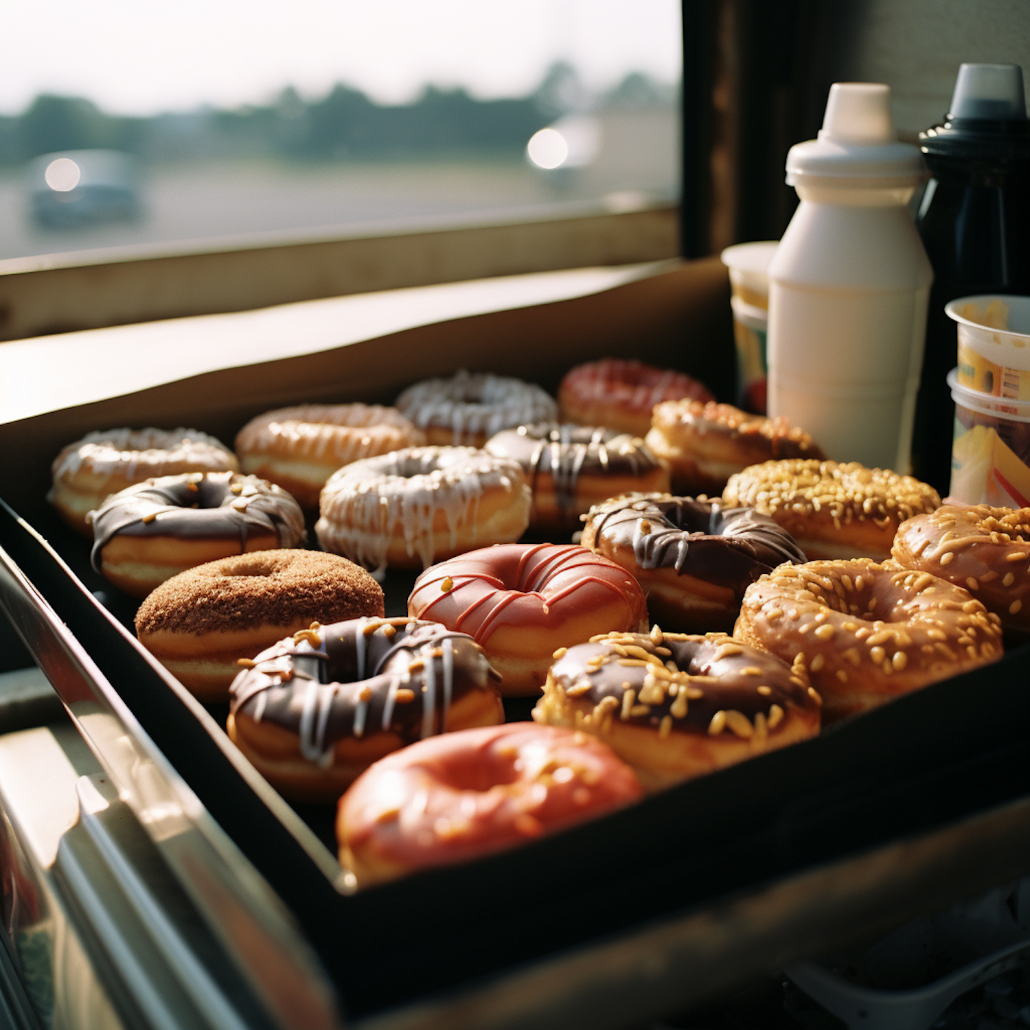 A tempting assortment of glazed and sprinkled donuts in a sunlit setting, perfect for a sweet treat.