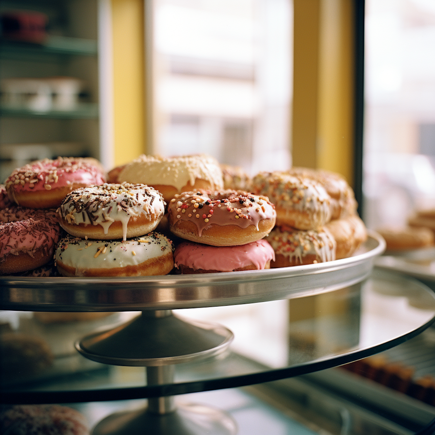 A tempting assortment of colorful donuts with sprinkles and icing on a bakery stand, illuminated by natural light.