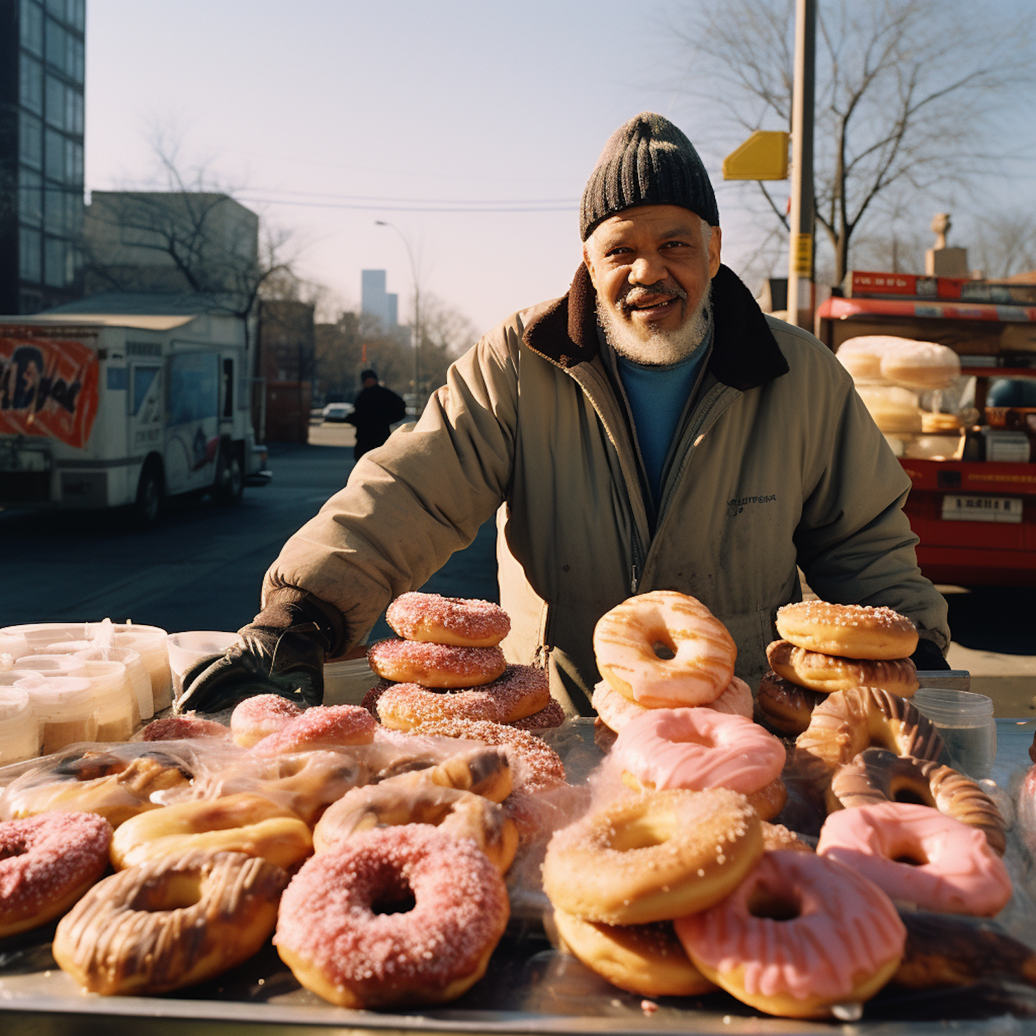 Cheery Donut Cart Vendor in Cool Urban Morning