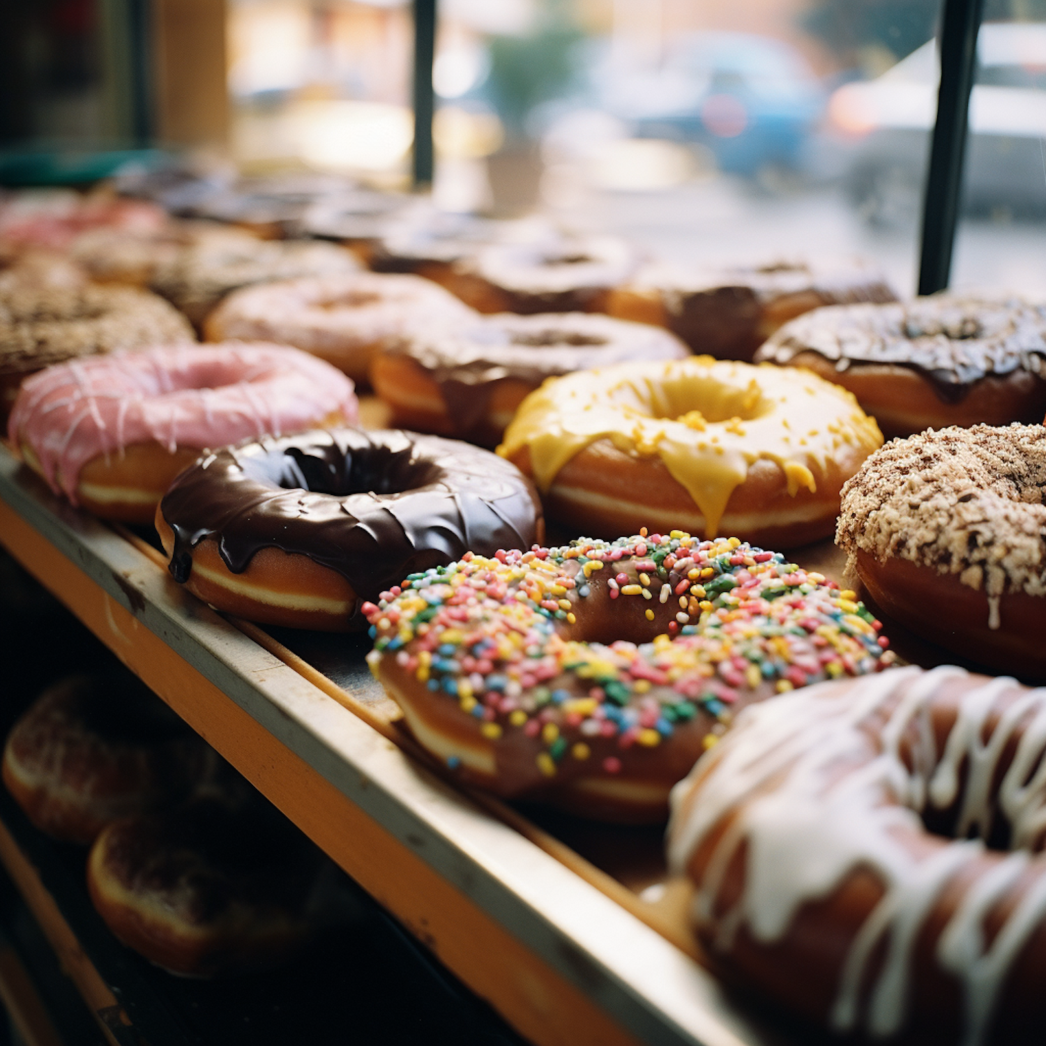 A tempting array of colorful donuts with sprinkles, chocolate, and various glazes on display in a bakery setting.