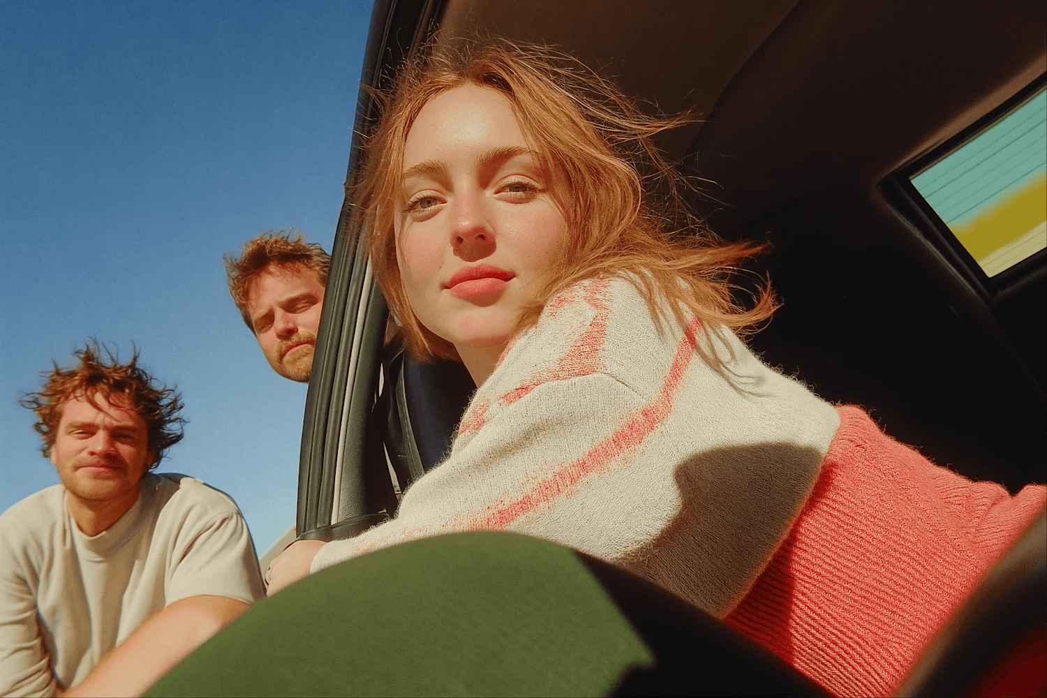 Three friends enjoy a sunny day, leaning out of a car window with a clear blue sky in the background, radiating a carefree vibe.