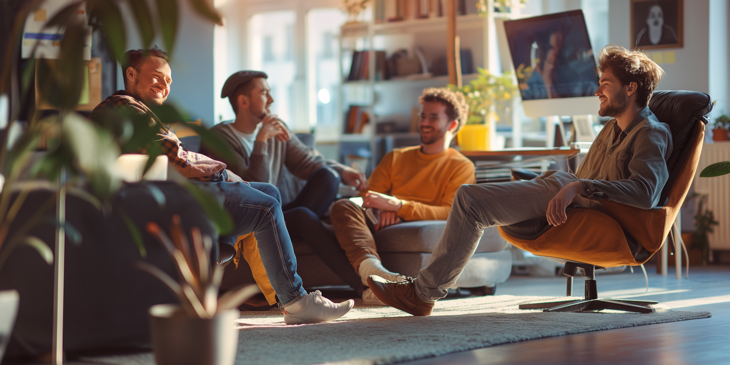Four friends enjoying a lively conversation in a sunlit living room, surrounded by plants and modern decor. Relaxed and friendly atmosphere.