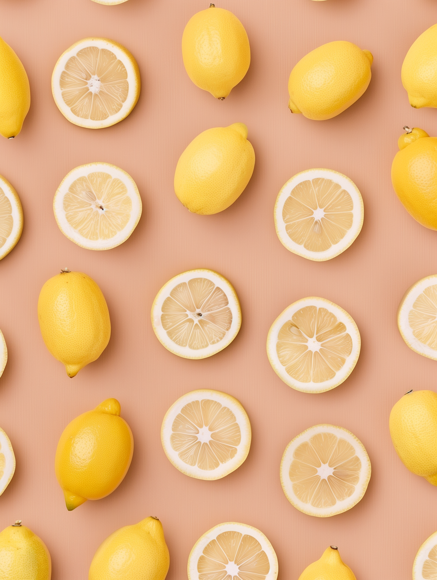 Bright yellow lemons and juicy halves arranged on a peach background, creating a fresh and vibrant pattern perfect for food or design themes.