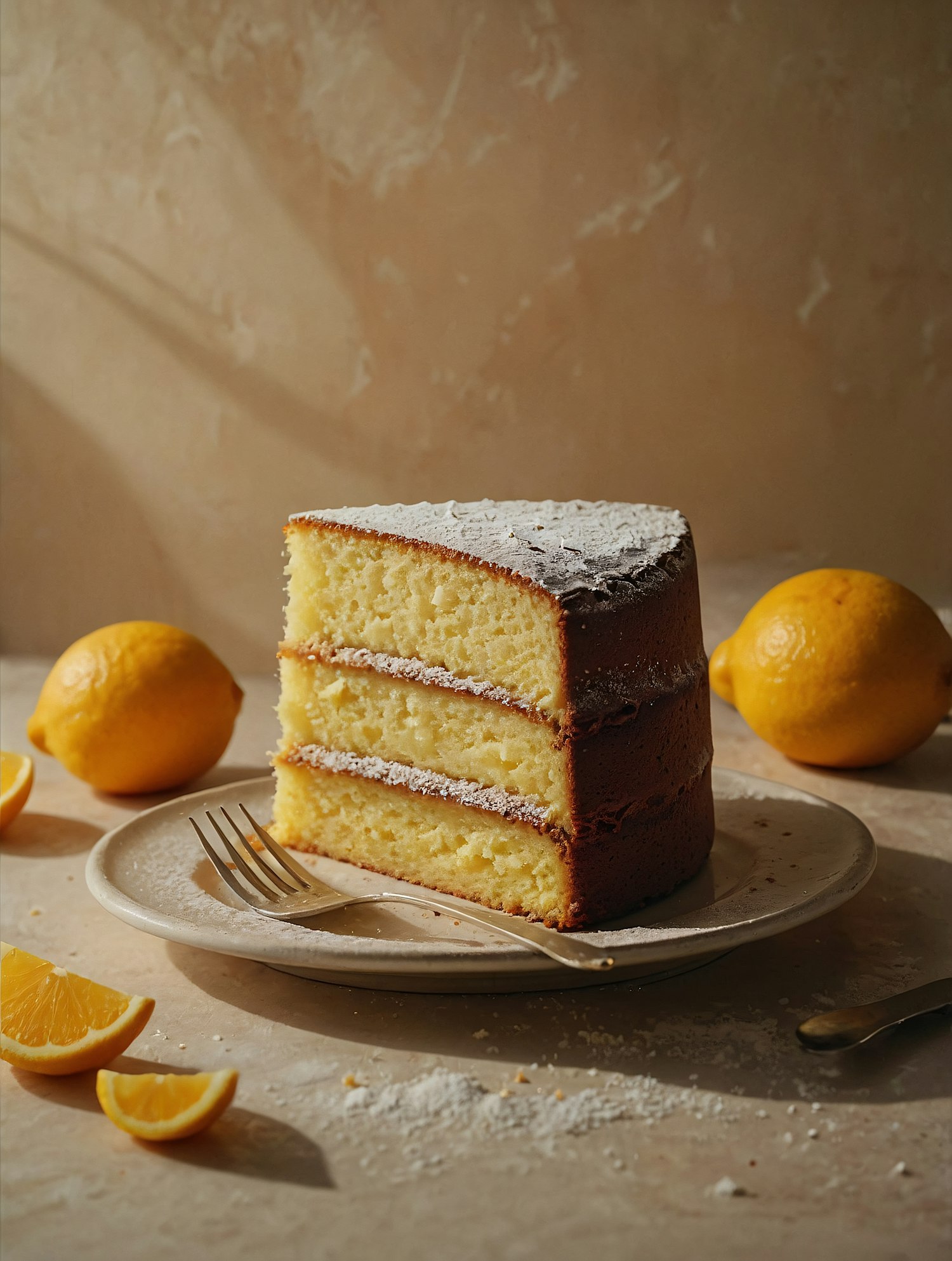 A moist three-layer lemon cake slice with powdered sugar, surrounded by fresh lemons and orange wedges on a rustic beige plate.