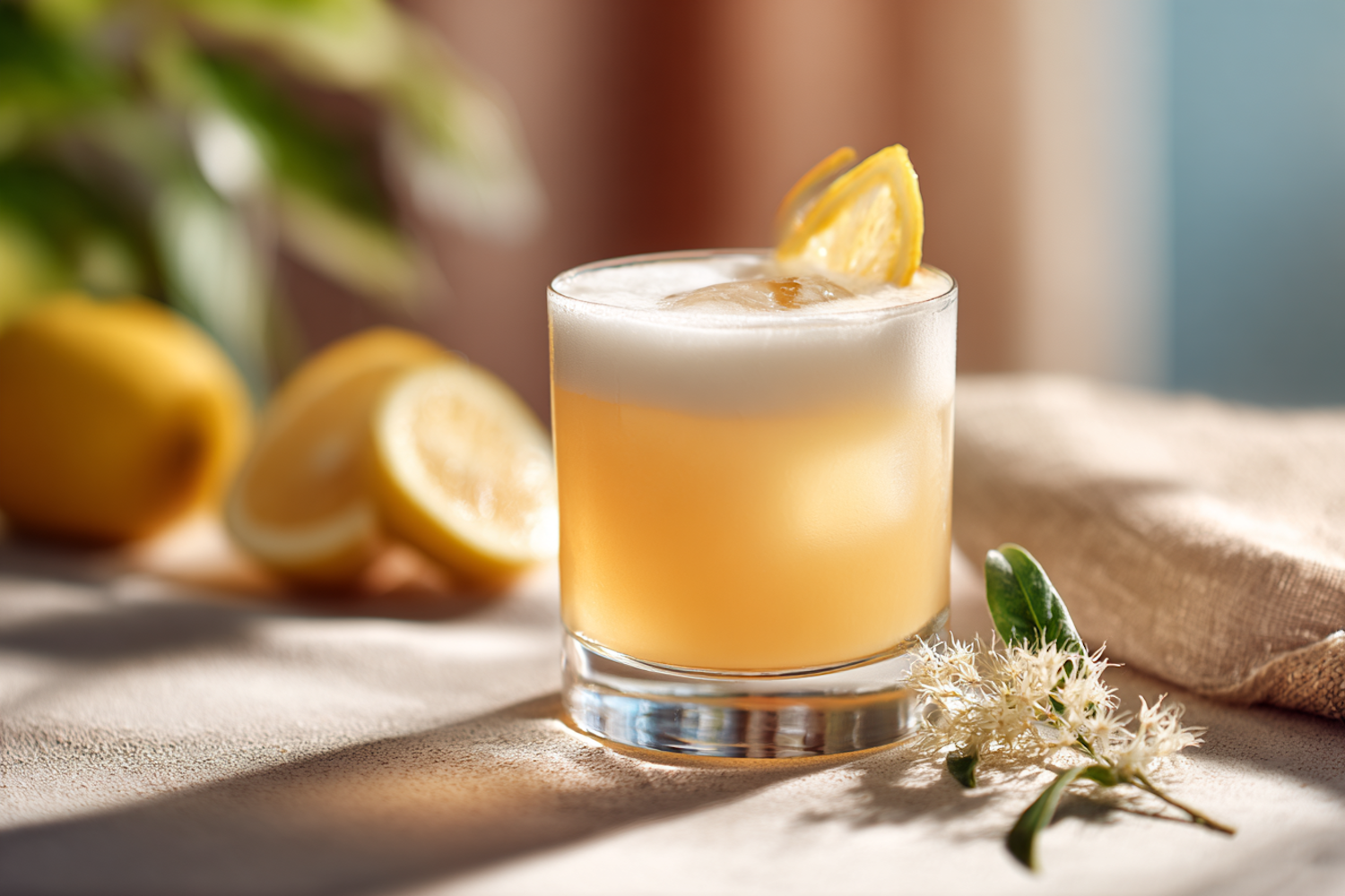 A frothy lemon cocktail in a short glass, garnished with lemon slices, surrounded by fresh lemons and flowers in soft, natural lighting.
