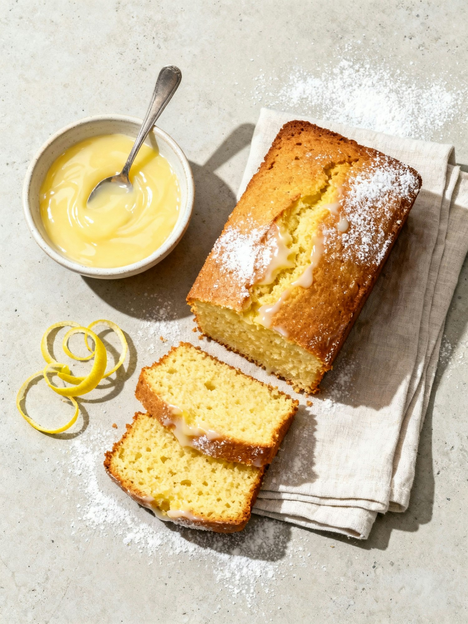 Golden lemon loaf cake with icing sugar, served with lemon curd and zest curls on a light background, perfect for a fresh dessert.