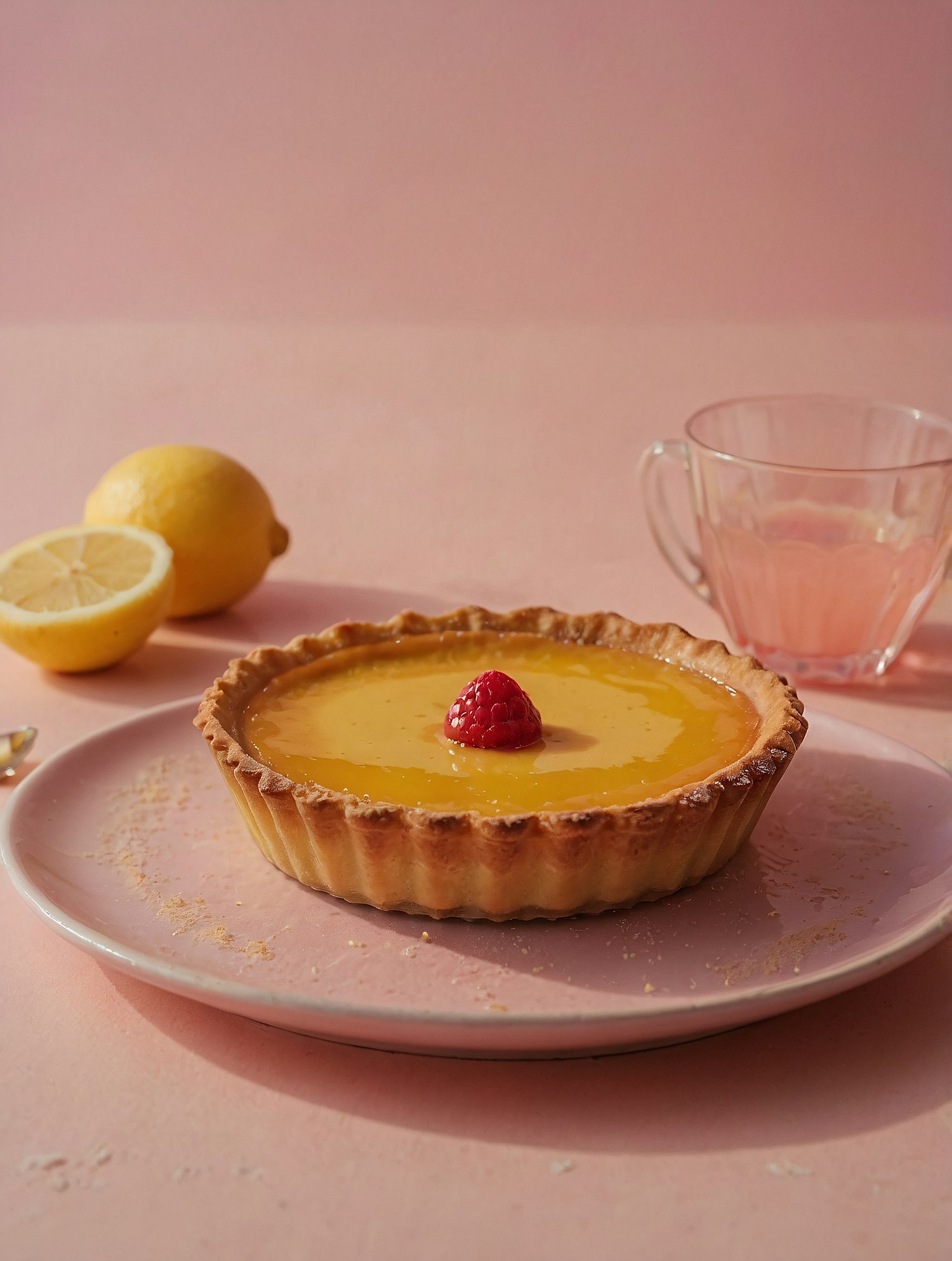 A delicious lemon tart with a raspberry topping, paired with a pink drink and fresh lemons, set against a pastel pink background.