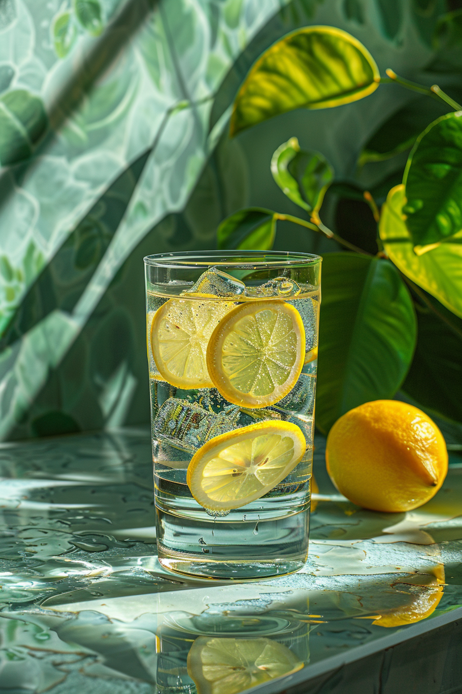 Refreshing glass of lemon water with ice, set against a lush green background, capturing sunlight and reflections.