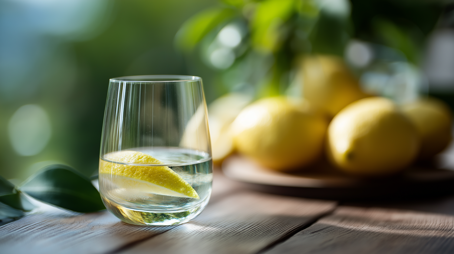 A glass of water with a lemon wedge on a wooden table, surrounded by fresh lemons and greenery in soft natural light.