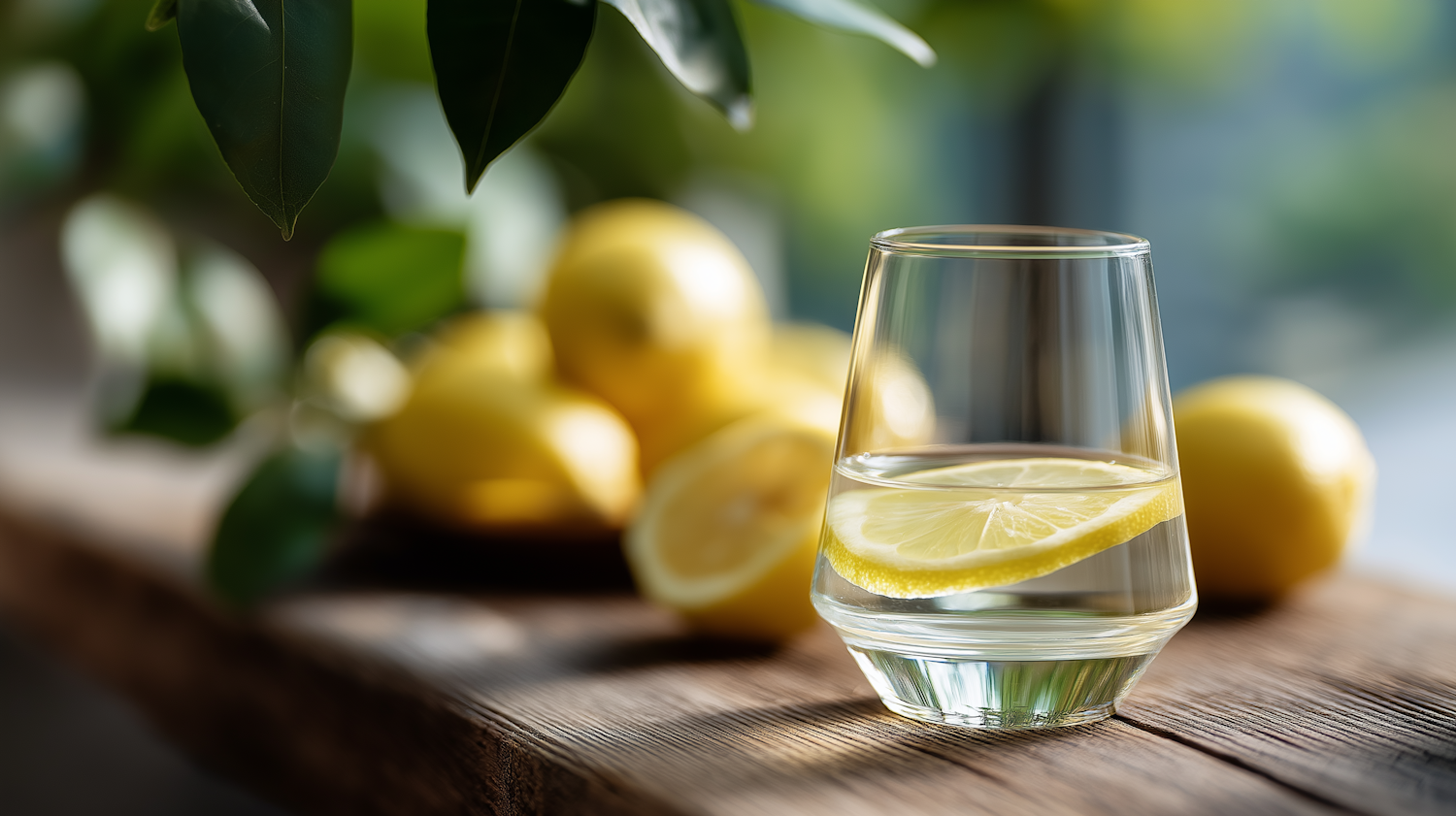 A glass of lemon water on a rustic wooden table, surrounded by fresh lemons and greenery, bathed in natural light.