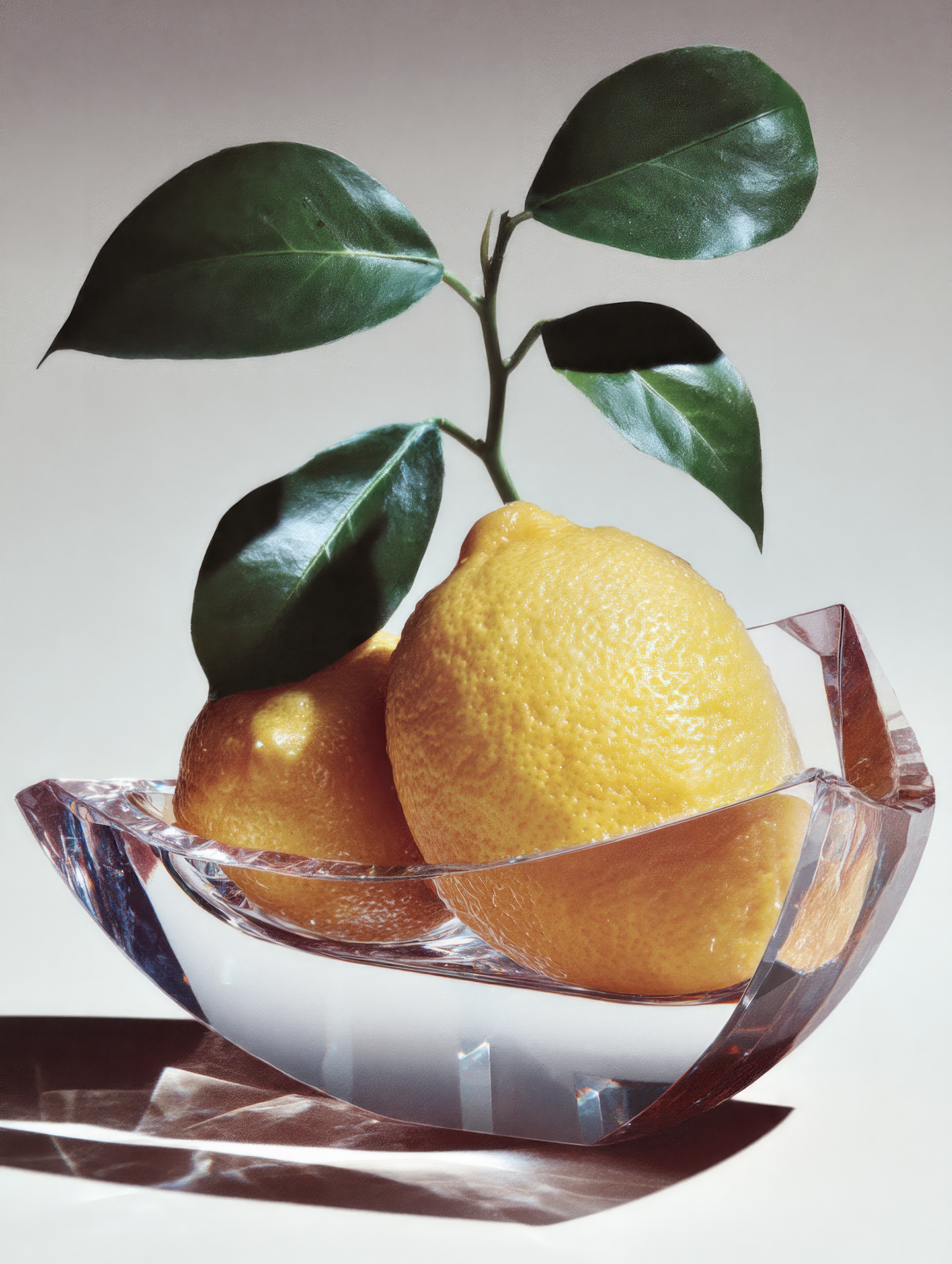 A vibrant still life of lemons in a clear glass bowl with green leaves, showcasing bright colors and elegant simplicity.
