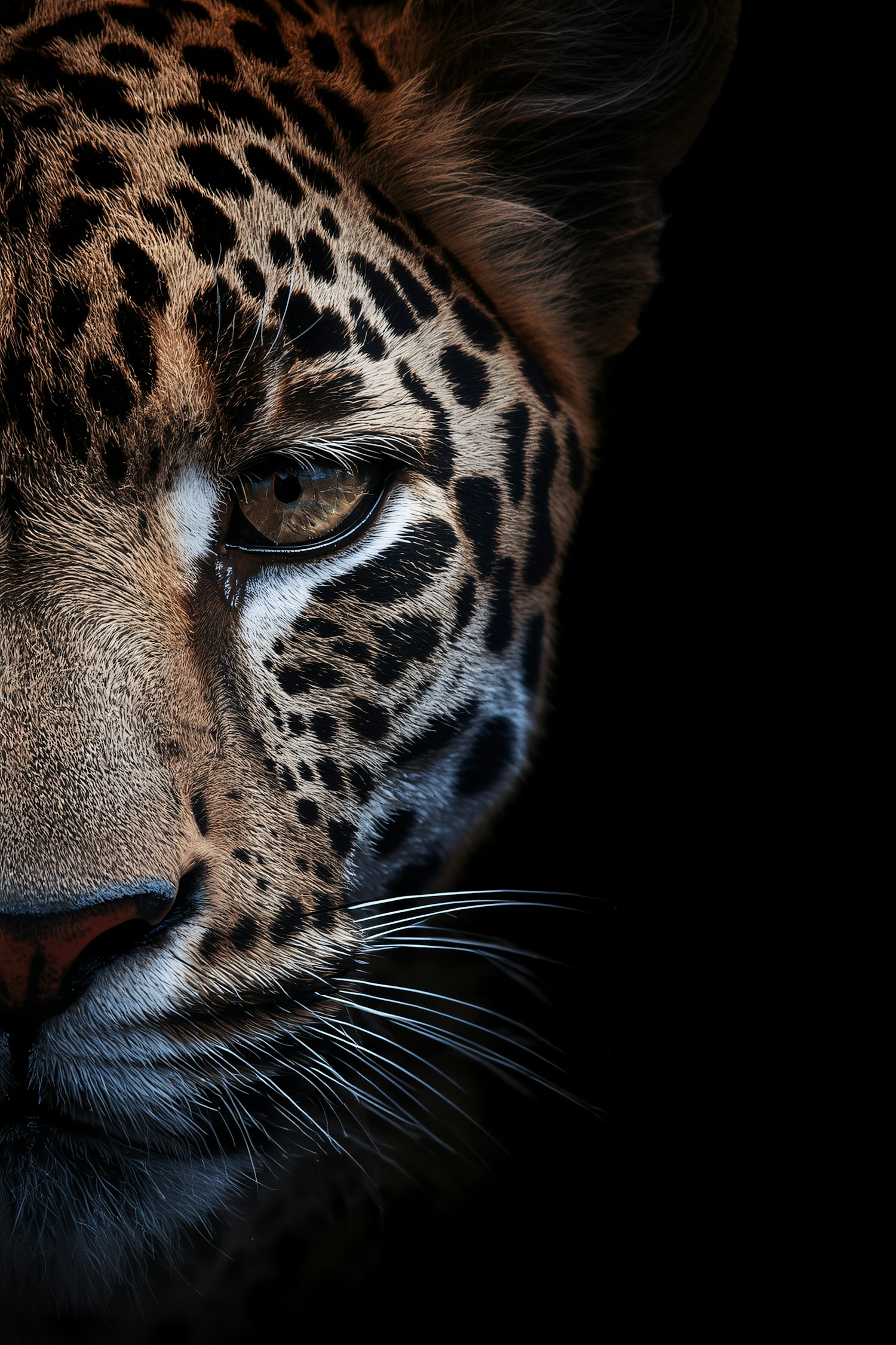 Close-up of a leopard's face with a focus on its eye and fur patterns, set against a black background for a dramatic effect.