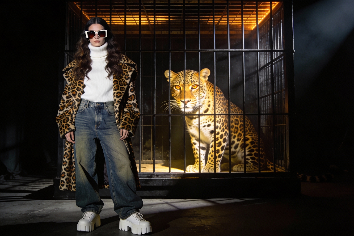 A stylish woman in a leopard-print coat stands before a caged leopard, creating a striking contrast in a dramatic, dimly lit setting.