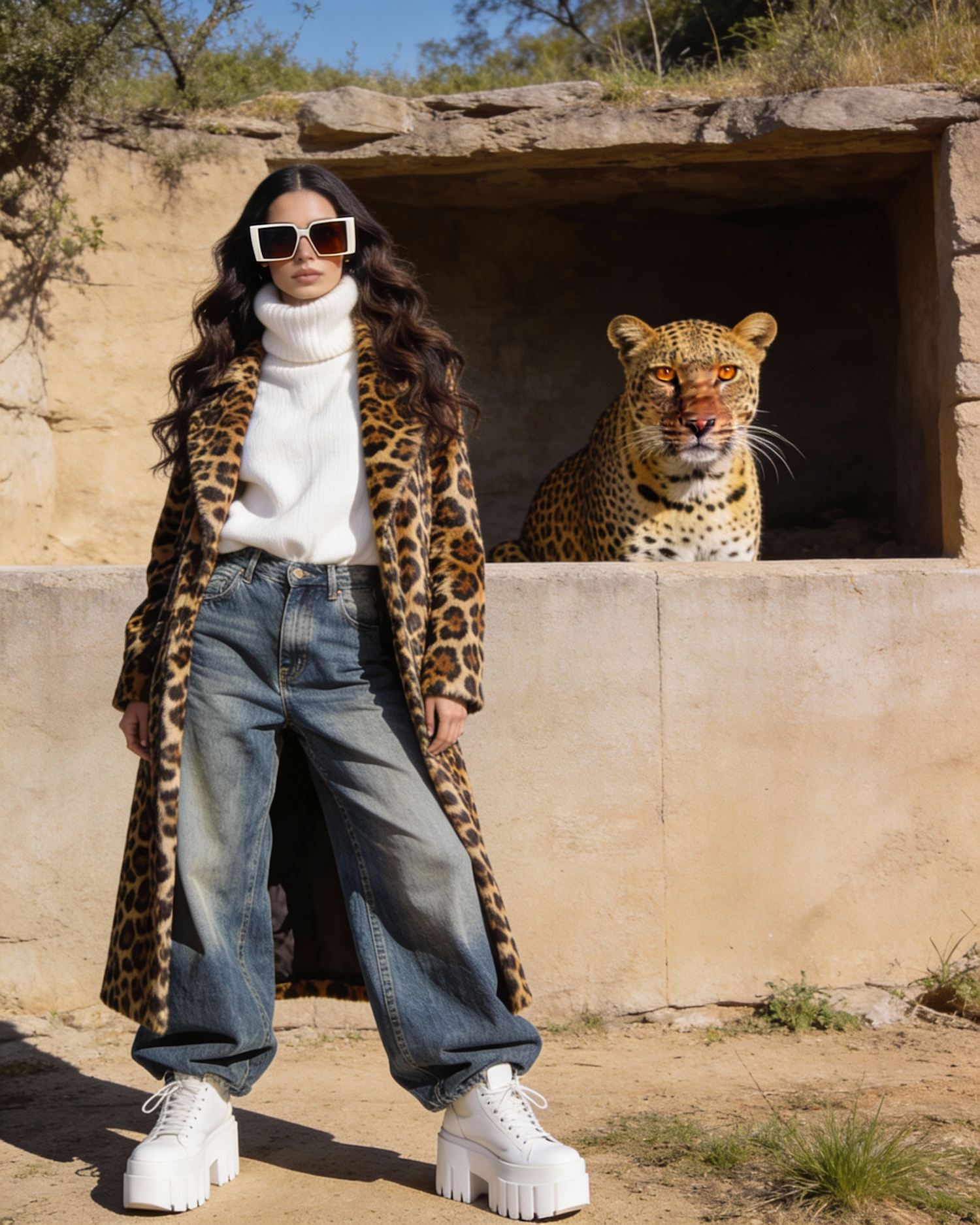Stylish woman in leopard-print coat poses with a leopard in a natural stone enclosure, blending fashion and wildlife in a striking scene.