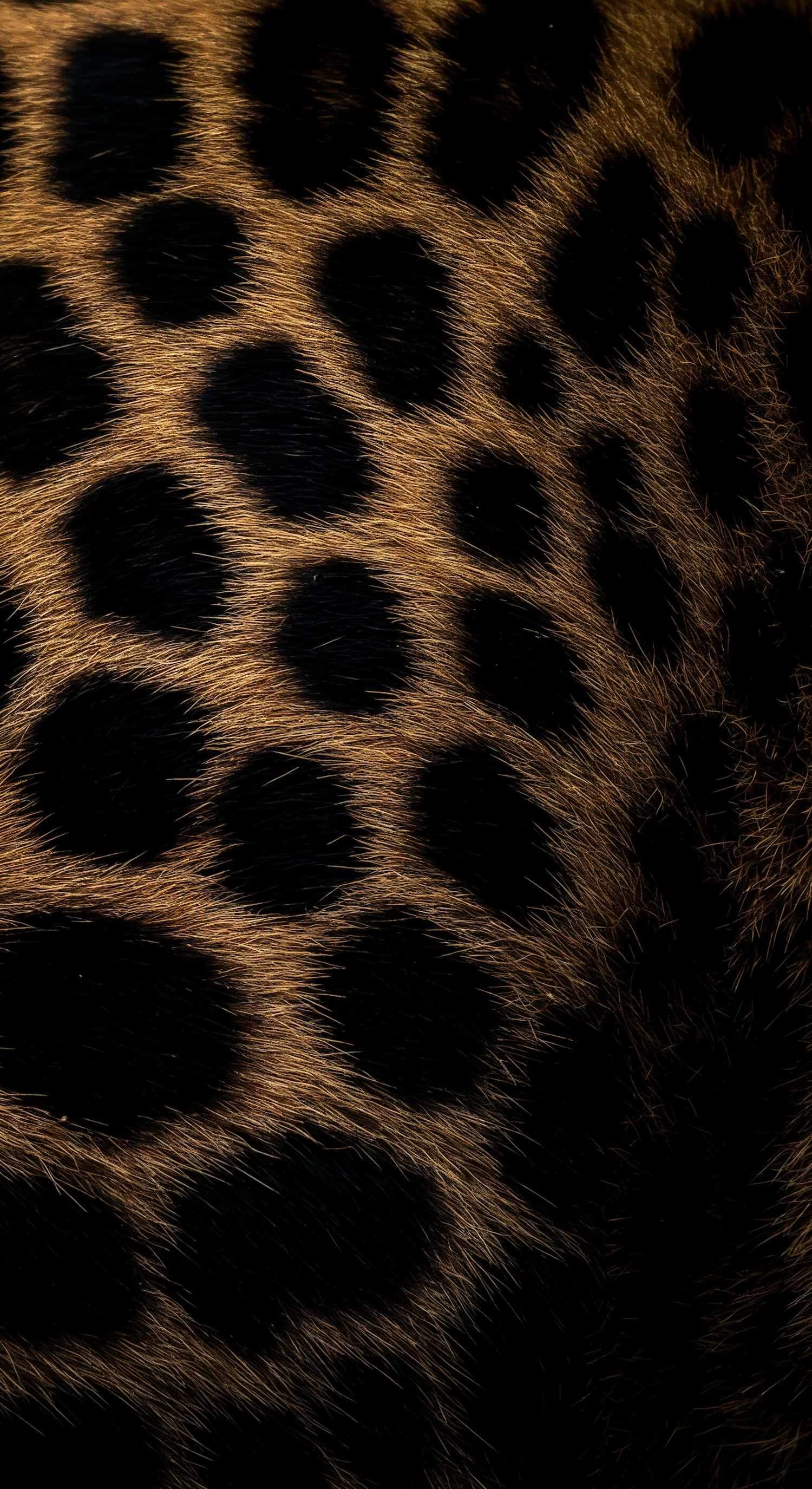 Close-up of leopard fur with golden-brown hues and black rosette patterns, showcasing intricate texture and natural beauty.