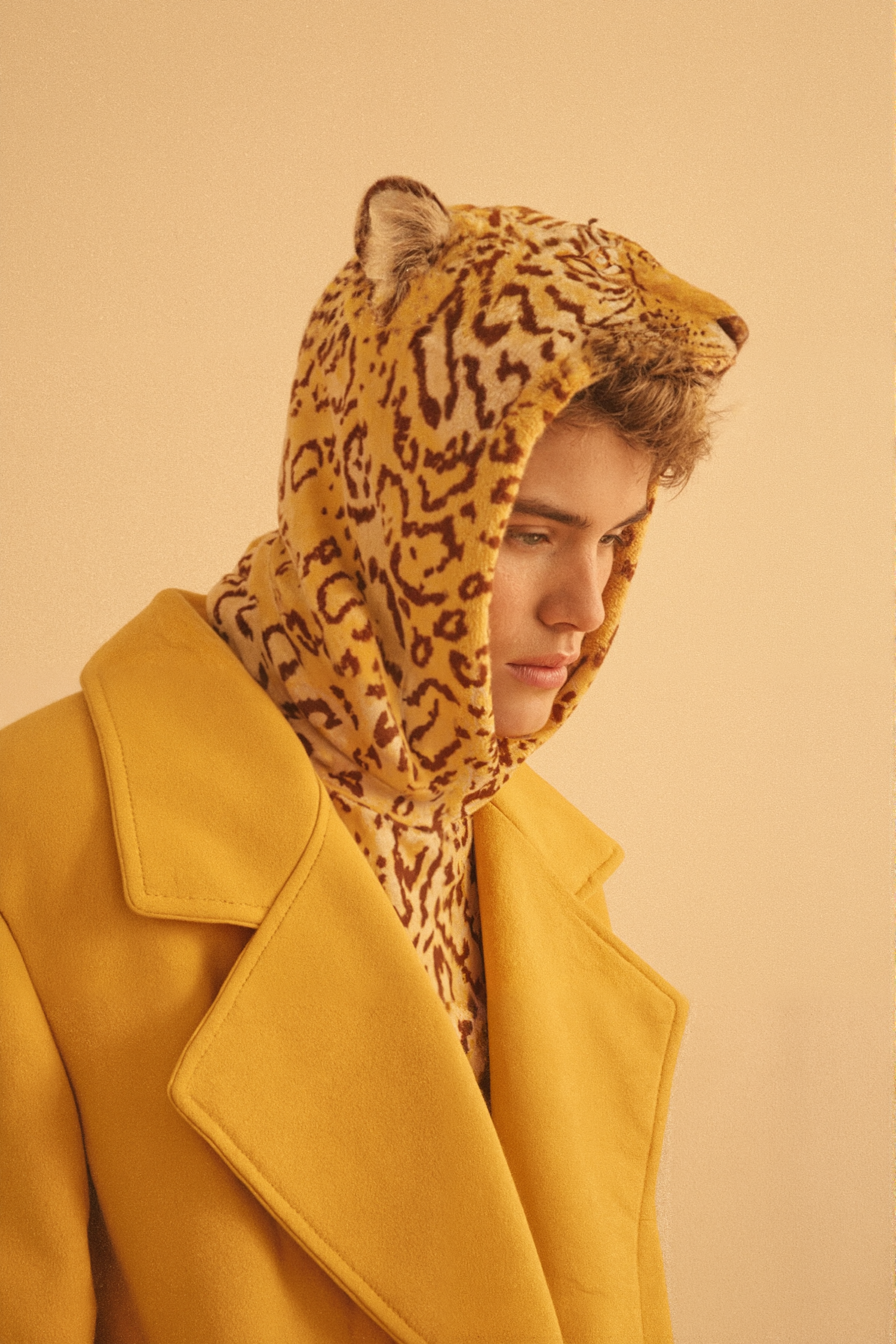 Stylish young man in a yellow coat and leopard-patterned hood, set against a beige background. Bold and unique fashion statement.