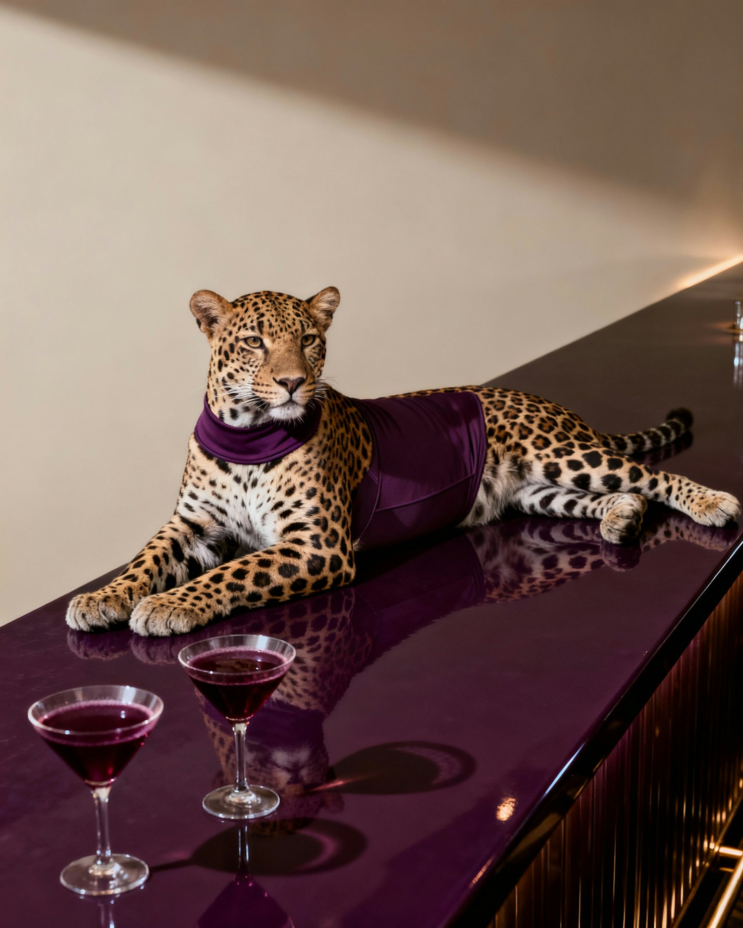 A leopard in a purple outfit lounges on a glossy surface with martini glasses nearby, creating a luxurious and unique scene.