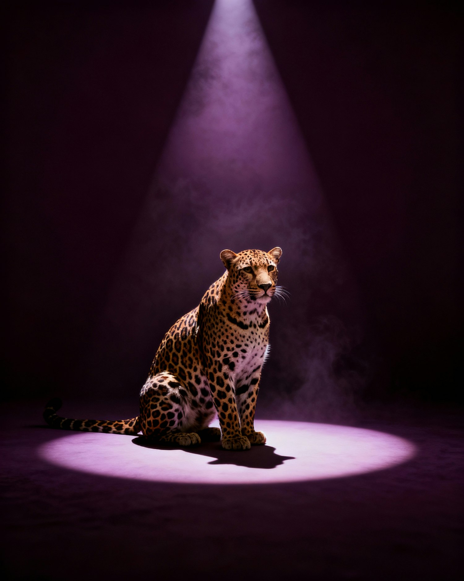 A realistic leopard sitting calmly in a minimal dark studio. A single deep plum spotlight creates dramatic sculptural shadows around the animal. The background fades into prune-black tones. No props, only atmospheric haze and premium editorial lighting. Cinematic, powerful, realistic, minimalist.
