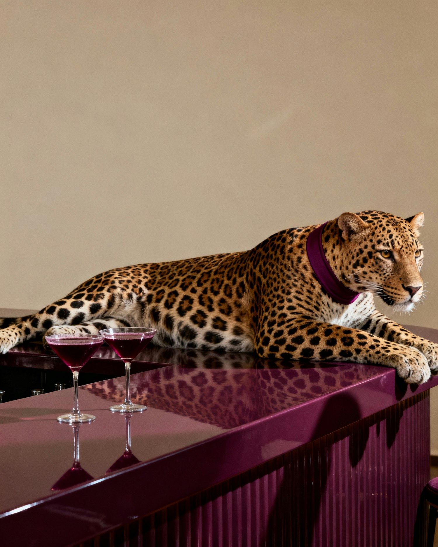 A leopard lounges on a glossy burgundy bar counter with two martini glasses, blending luxury and the wild in a striking composition.