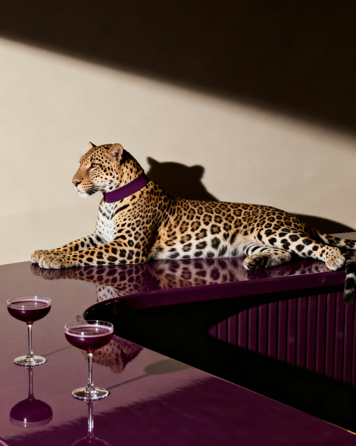 High-end editorial sports photography, soft directional lighting, sculptural shadows, premium activewear textures, muted beige and deep plum tones, clean minimal background, cinematic sophistication, realistic skin texture, no overprocessed look, elegant composition, high-fashion athletic aesthetic. A realistic leopard lying elegantly on a sleek bar counter finished in deep plum lacquer. Low warm bar lighting, shadows falling across the surface. A minimal deep-plum collar around the leopard’s neck. On the counter: two cocktails in rich deep plum tones with subtle reflections. Dark, luxurious, moody atmosphere with deep plum highlights and premium realism.