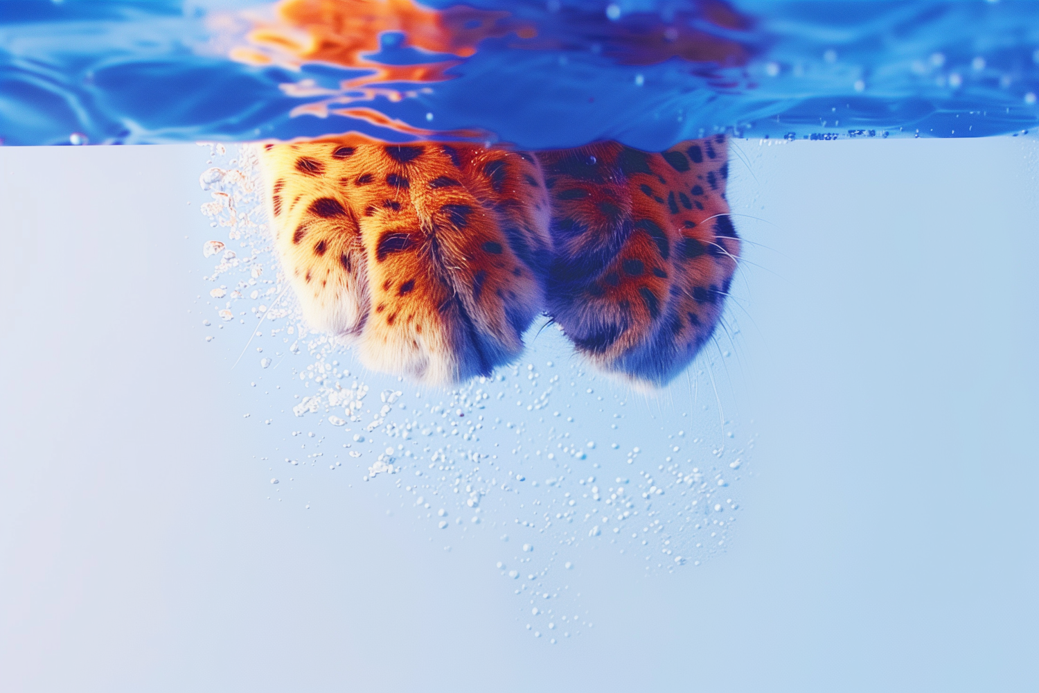 Leopard paws submerged in clear blue water with bubbles rising, creating a vibrant contrast of orange fur and blue hues.