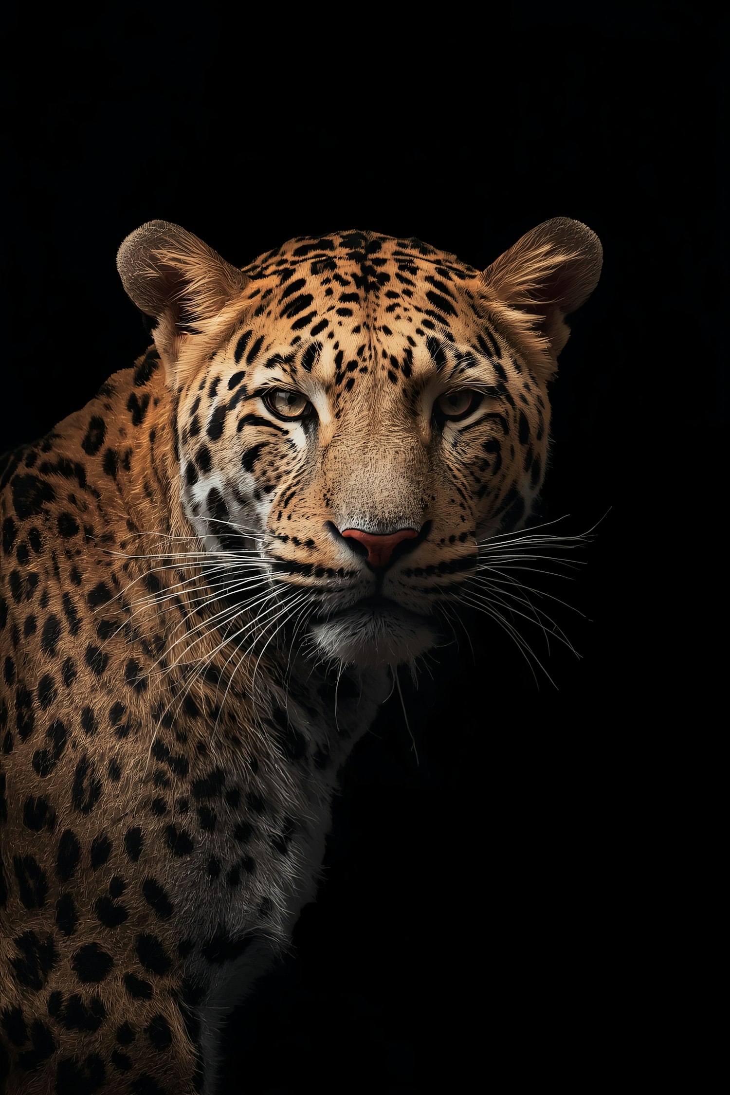 A stunning close-up of a leopard with a black background, showcasing its golden fur and intense gaze in striking detail.