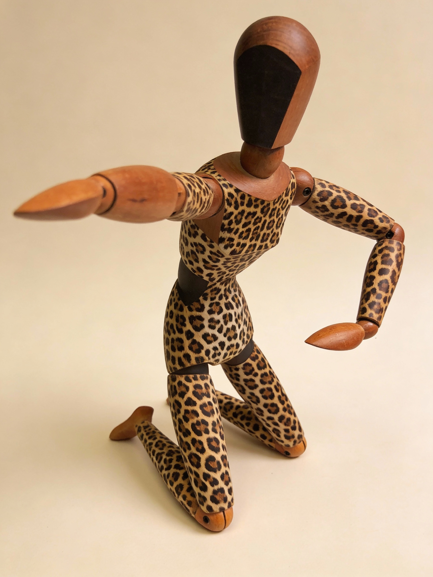A wooden mannequin with leopard-print design kneels dynamically on a neutral background, showcasing its articulated joints and artistic style.