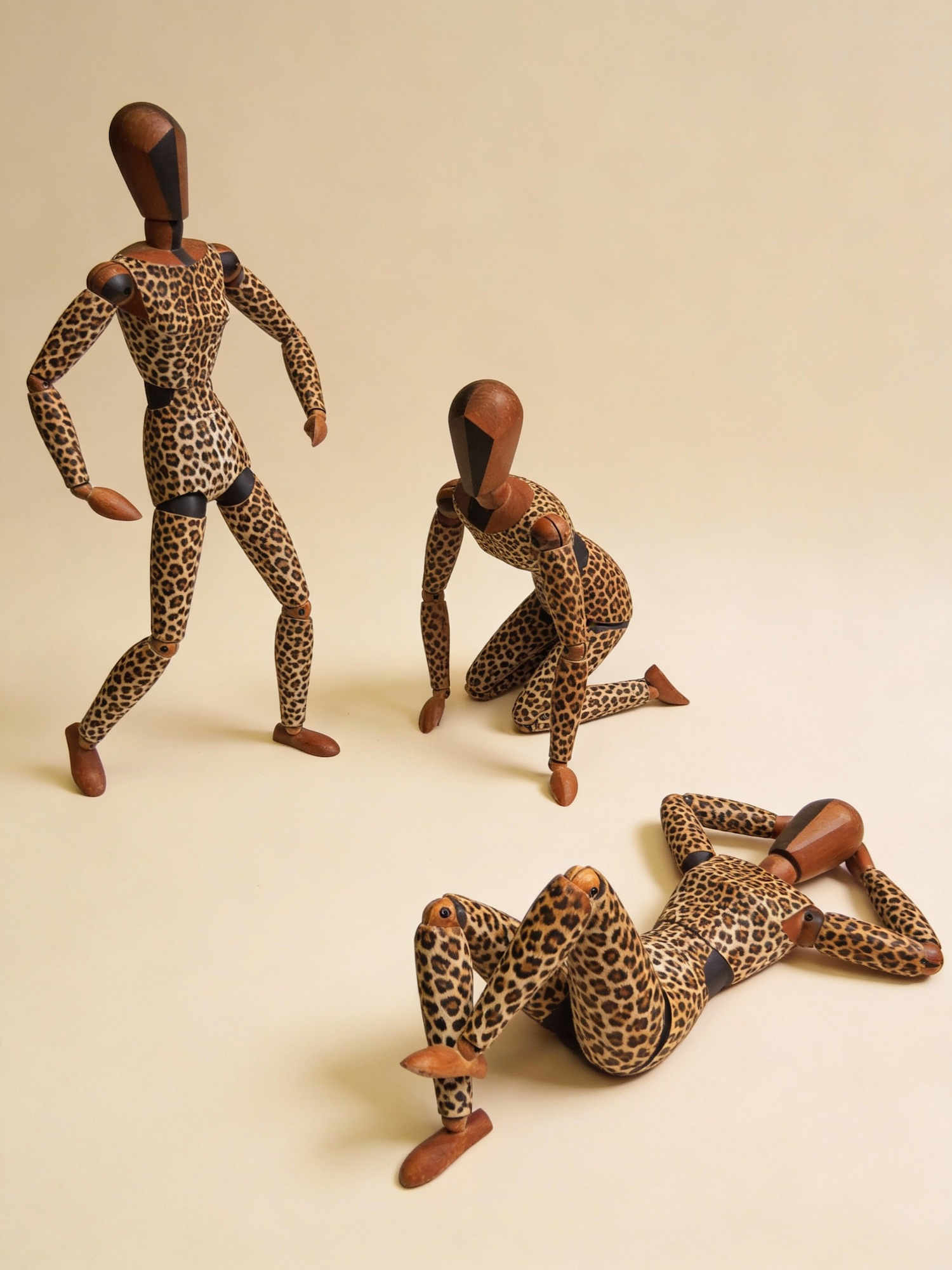 Three wooden mannequins with leopard print patterns are posed dynamically against a neutral background, showcasing artistic creativity.
