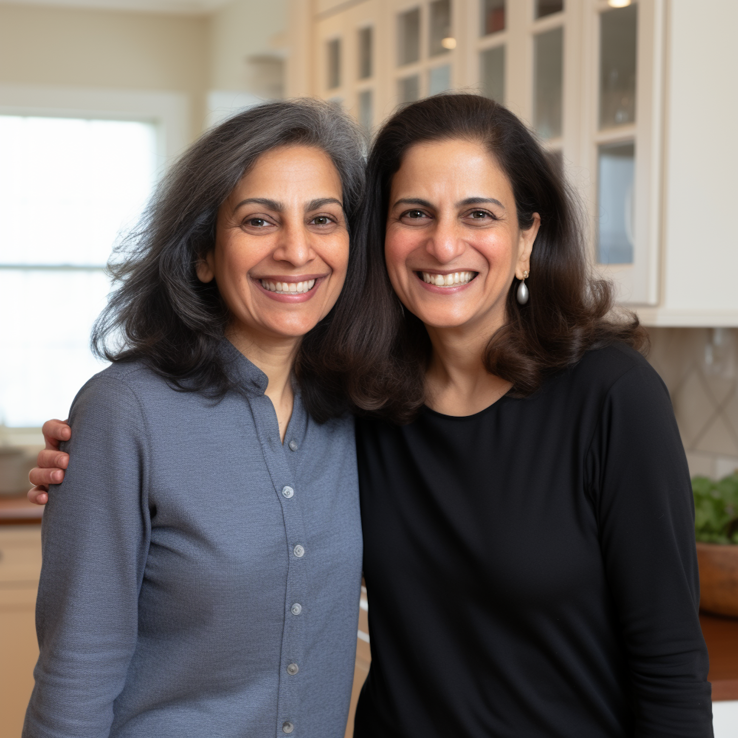 Two smiling women in a cozy kitchen, embracing and exuding warmth and friendship.