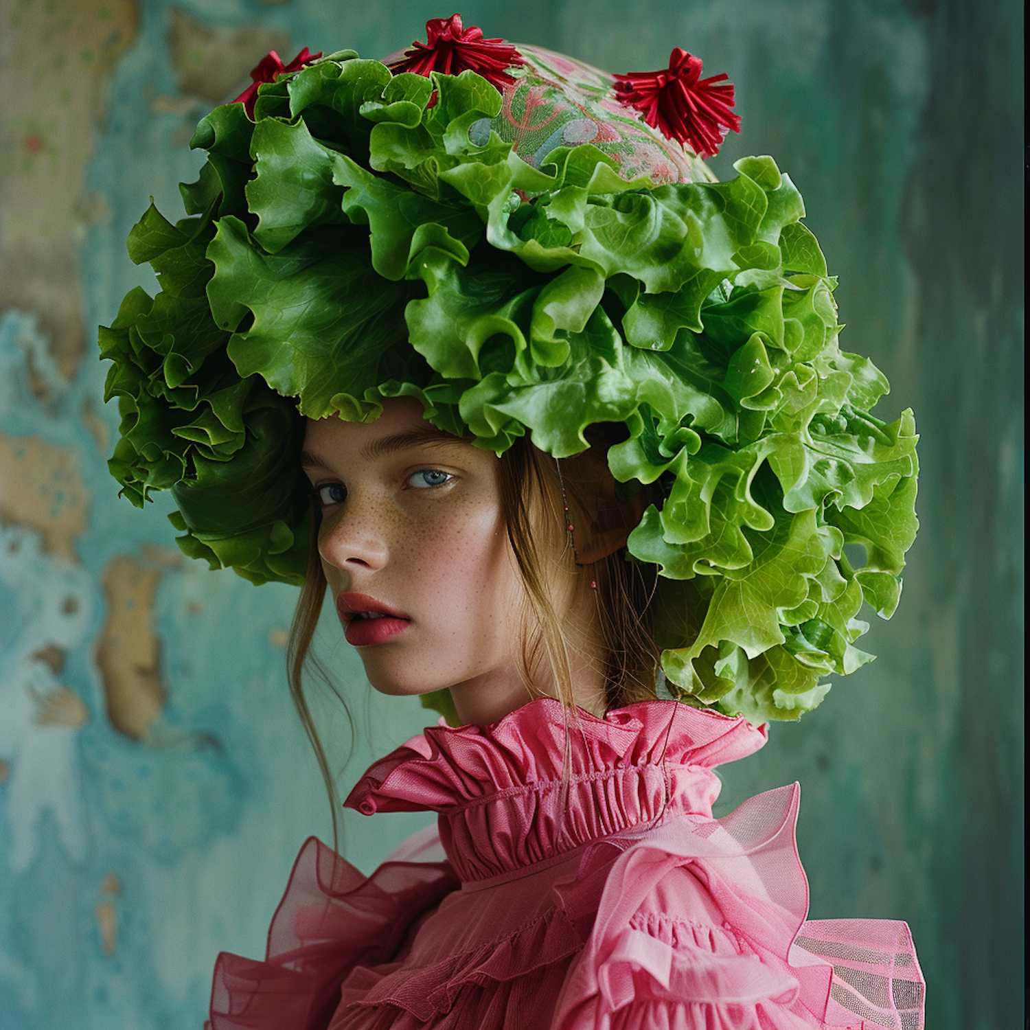 A young woman in a pink dress wears a whimsical lettuce headpiece, set against a textured teal background.