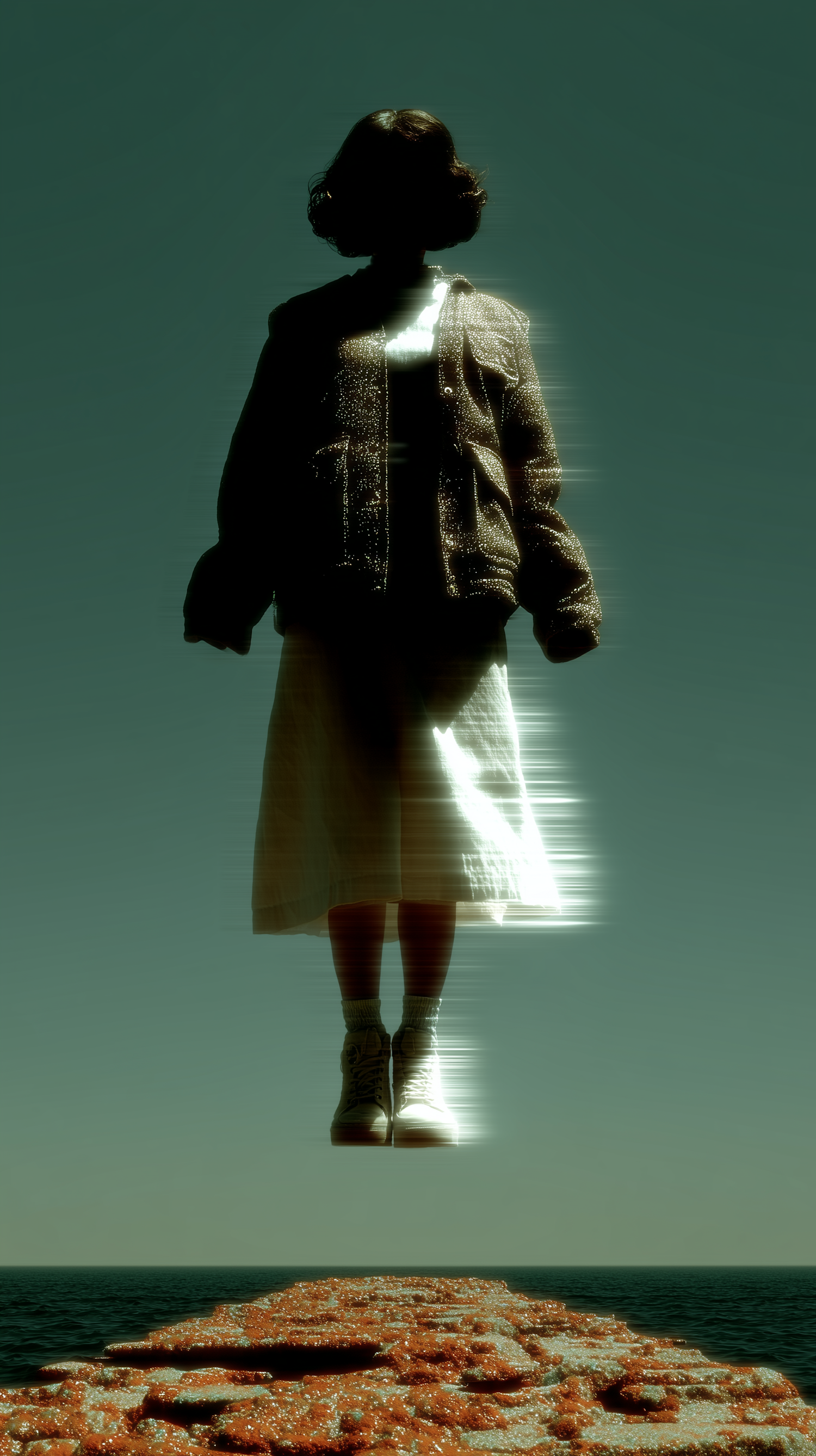 A surreal image of a person levitating above a rocky shore, with glowing effects and a calm sea in the background.