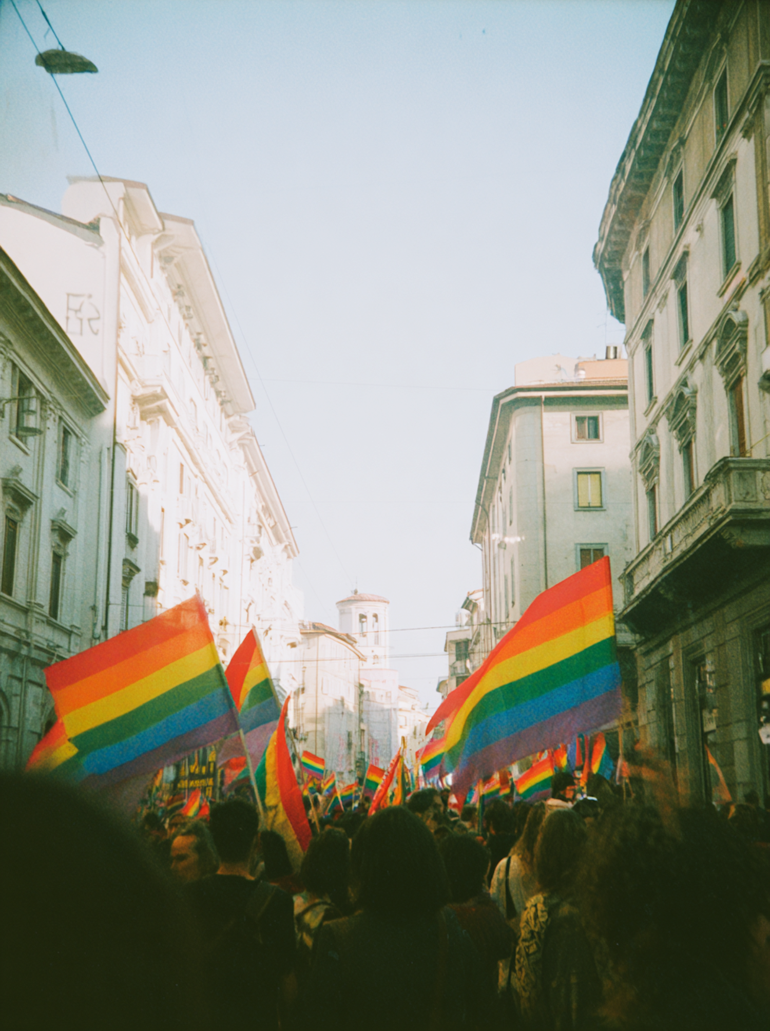 Celebratory crowd with rainbow flags fills a historic street, under clear skies, during a pride parade or public gathering.