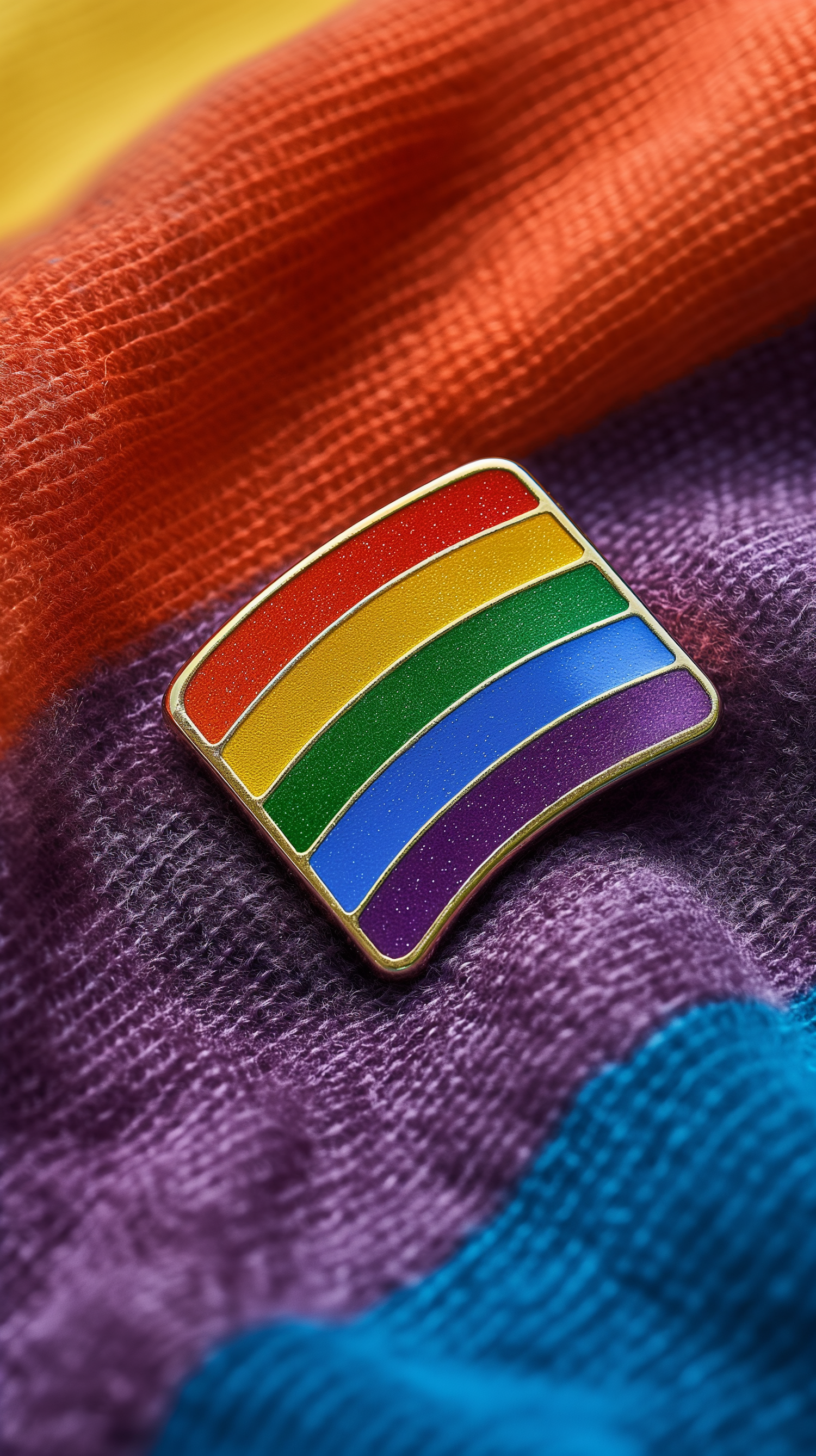 Colorful rainbow pin on textured fabric, symbolizing pride and diversity with vibrant stripes and a glossy finish.