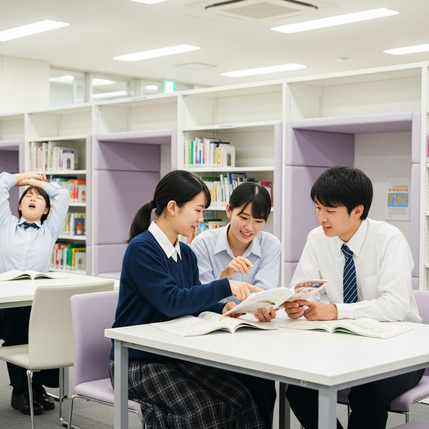 Students studying together in a bright library, collaborating on a project while another student stretches in the background.