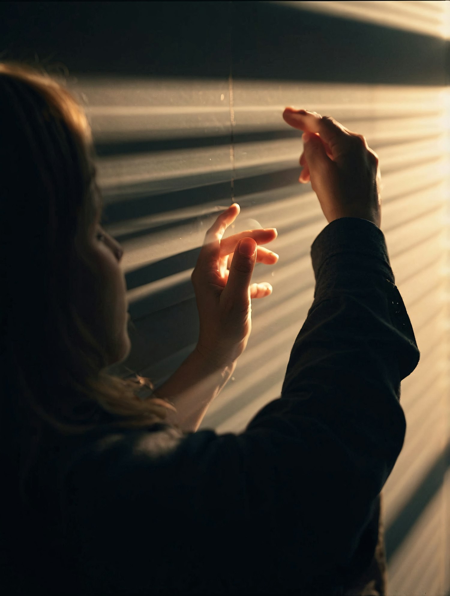 A person gently touches blinds as warm sunlight streams through, creating dramatic shadows and a serene, contemplative atmosphere.