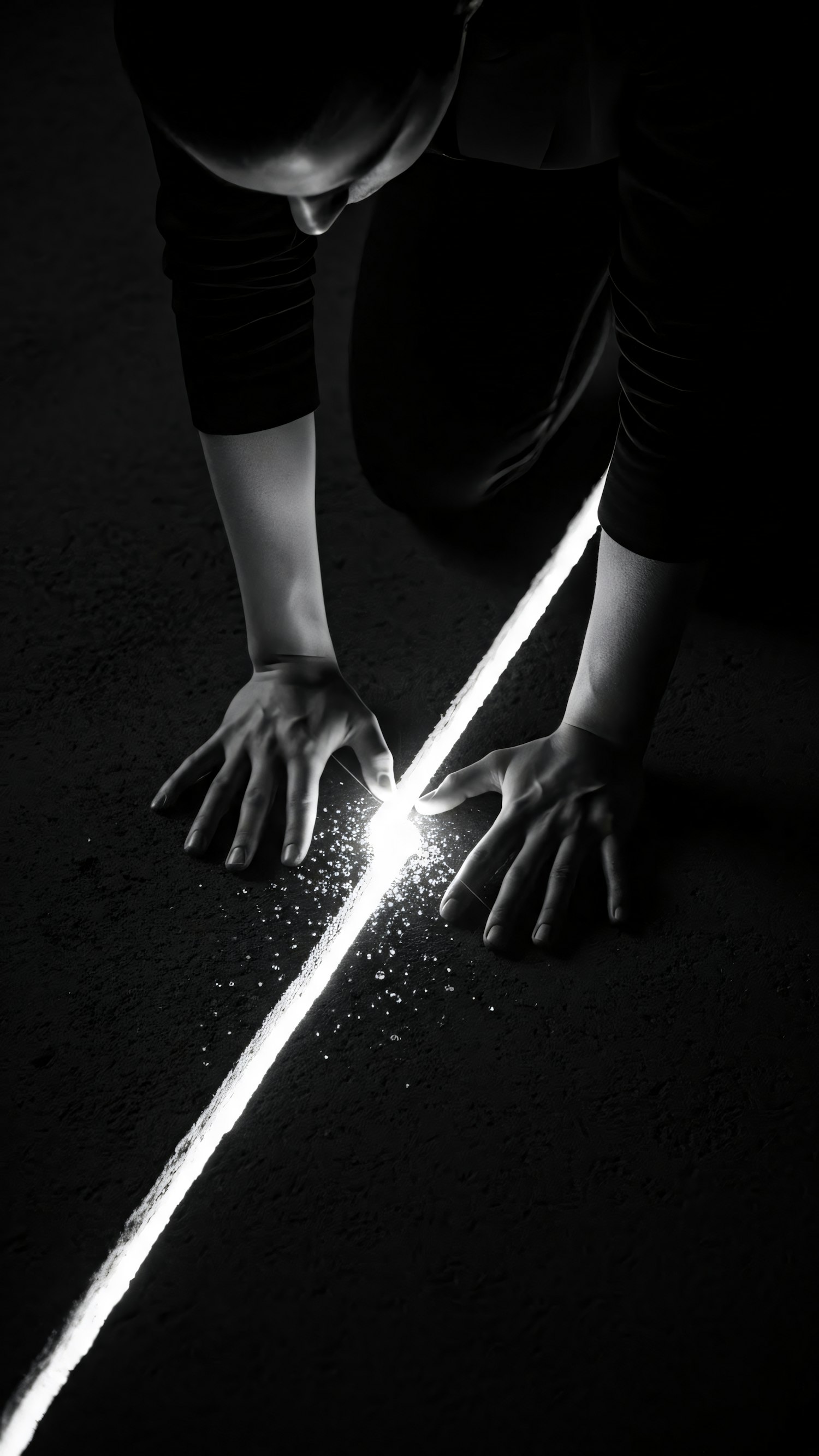 A person kneels on a dark surface, interacting with a glowing line of light, creating a dramatic and mysterious visual effect.