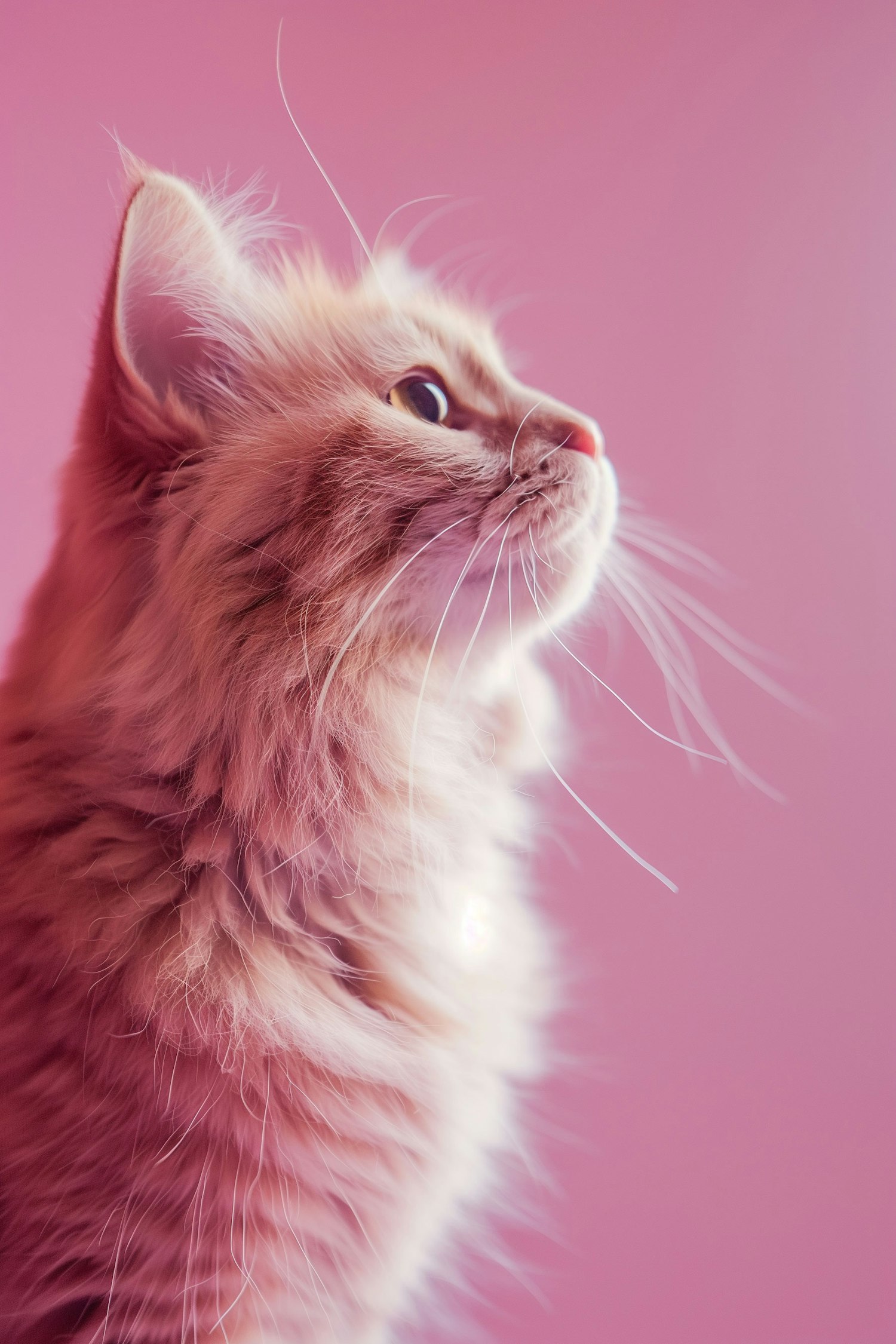 Close-up of a fluffy orange tabby cat gazing upward against a pink background, highlighting its soft fur and long whiskers.