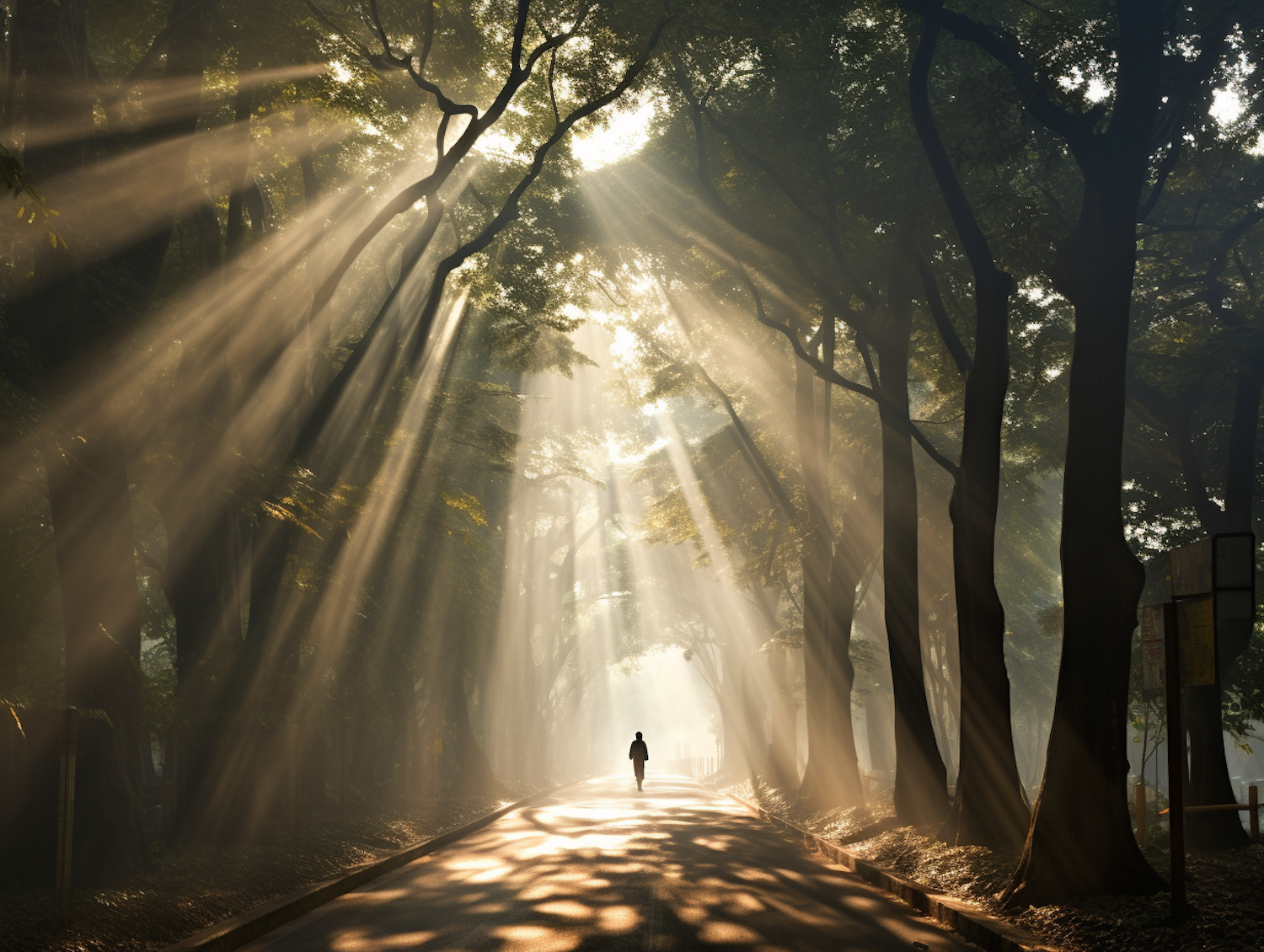 A lone figure walks down a sun-dappled, tree-lined path, with sunlight streaming through the canopy, creating a serene atmosphere.