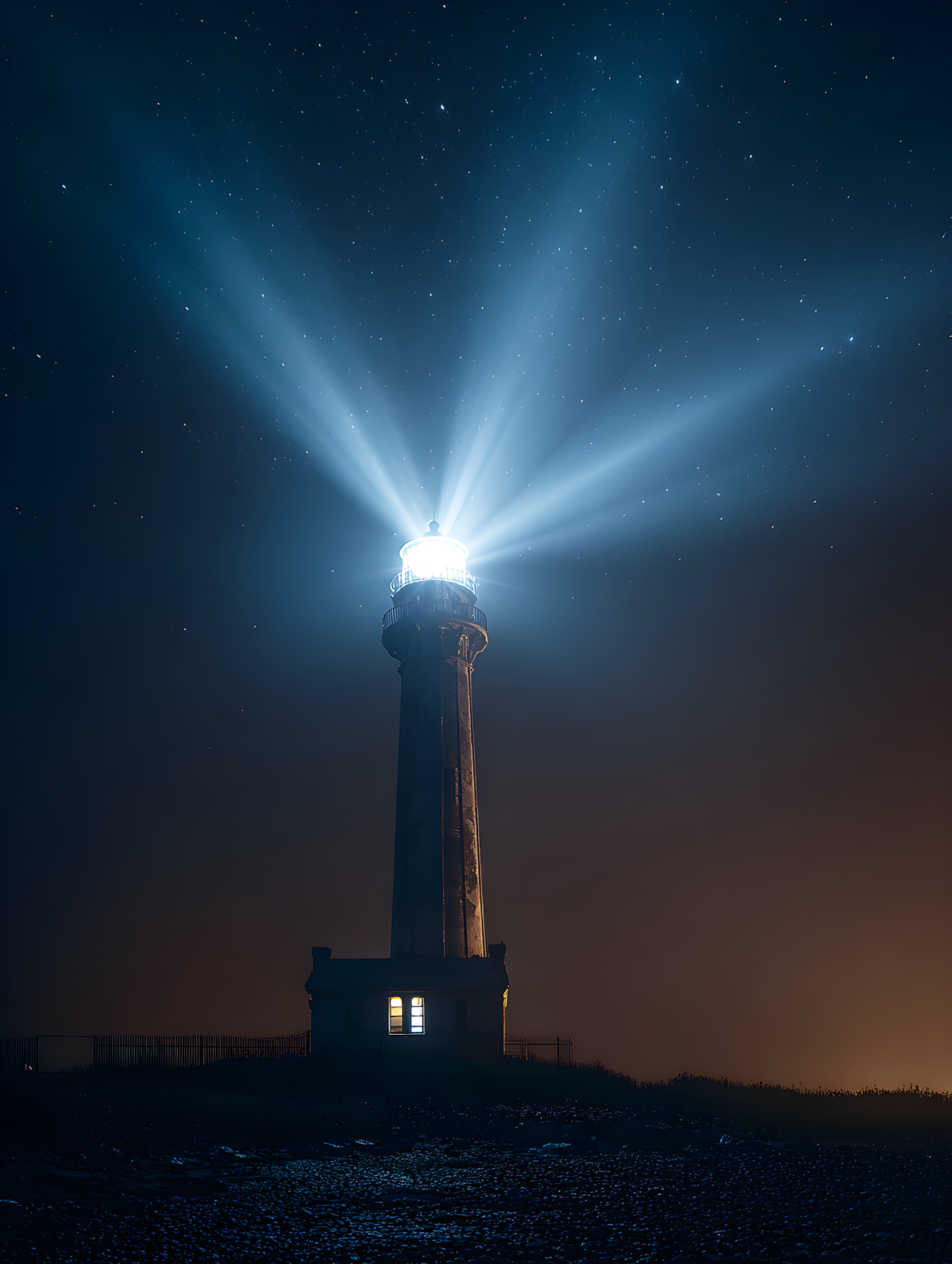 A lighthouse shines brightly under a starry night sky, its beams cutting through the darkness, creating a serene and striking scene.