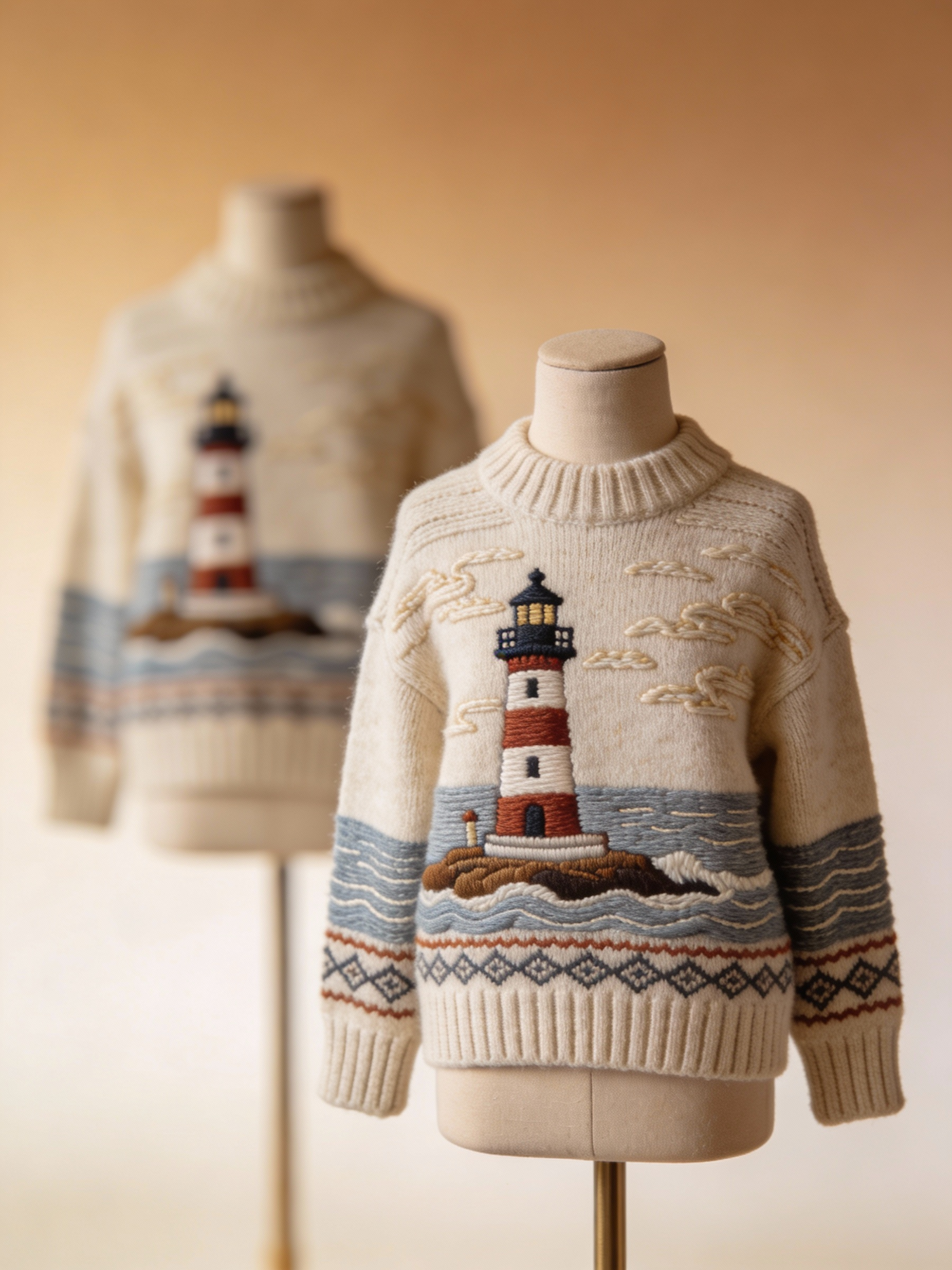 Cozy cream sweaters with intricate lighthouse embroidery on mannequins, perfect for a nautical-themed wardrobe.